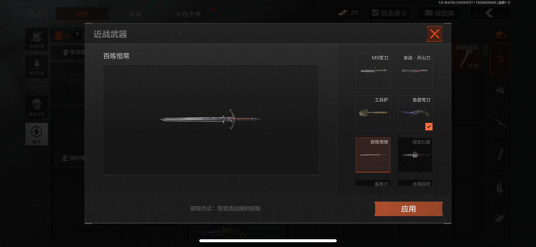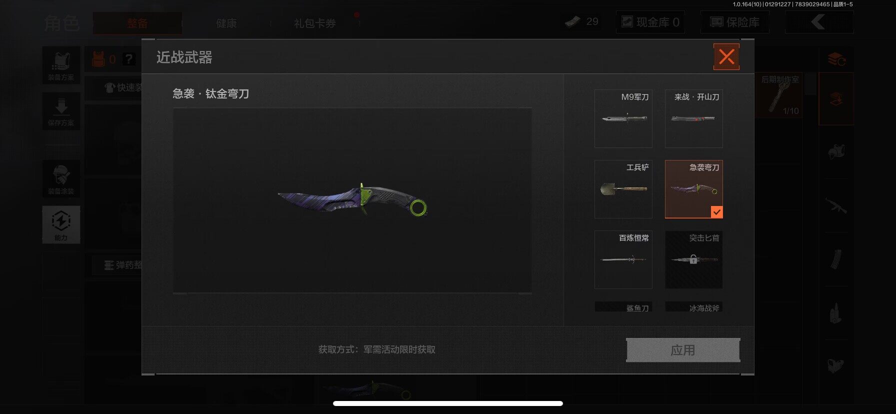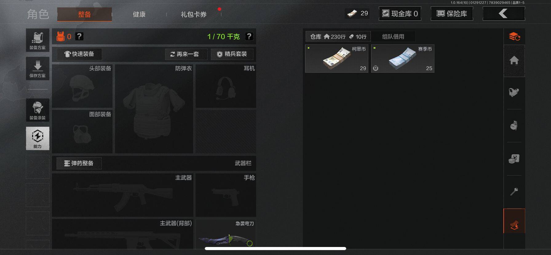 等级:30/段位:王牌/仓库价值(百万):1/柯恩币:1/急袭弯刀/百炼恒常/深潜行者II/冥河