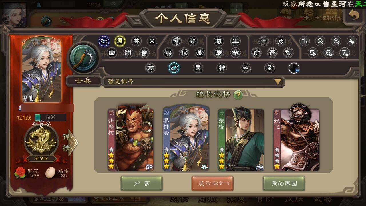 官阶:先锋将军;VIP等级:VIP1;史诗武将数量:4;动态皮肤数量:2;武将