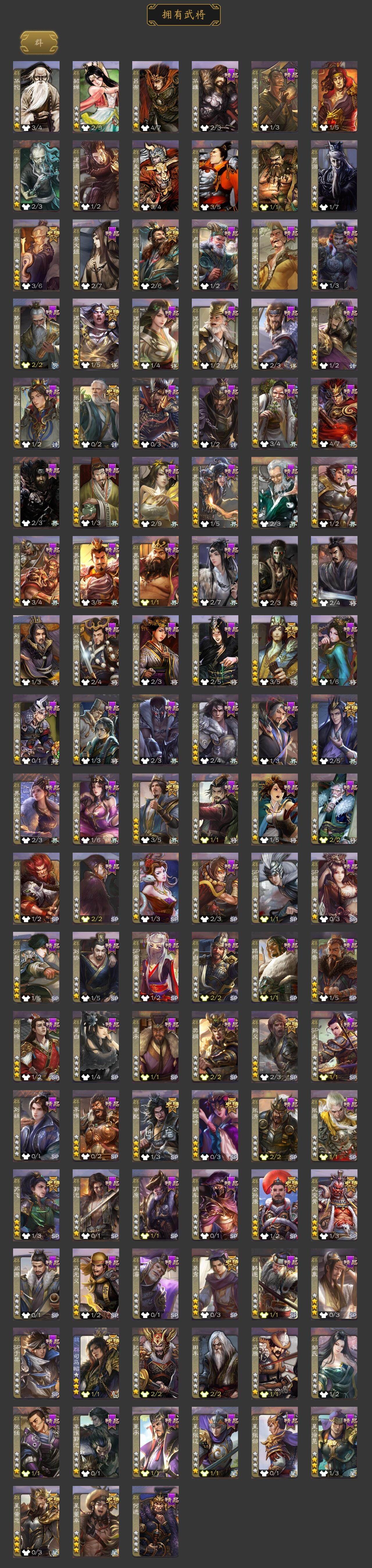 官阶:大将军;VIP等级:VIP11;史诗武将数量:57;动态皮肤数量:28;武将总数:419;史诗宝珠数量:20;将魂数量:2792;神将:8;魏国史诗武将:22;蜀国史诗武将:12;吴国史诗武将:7;群史诗武将:18