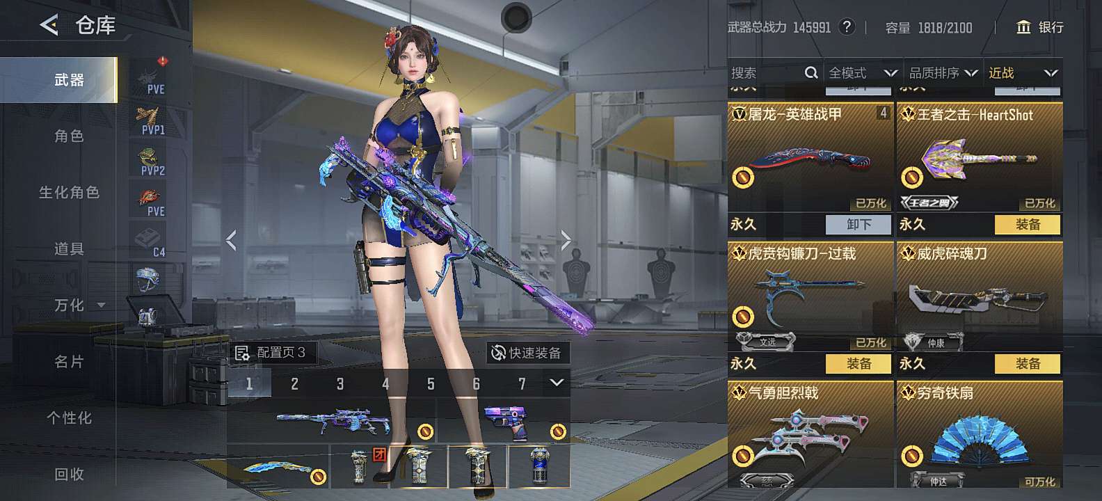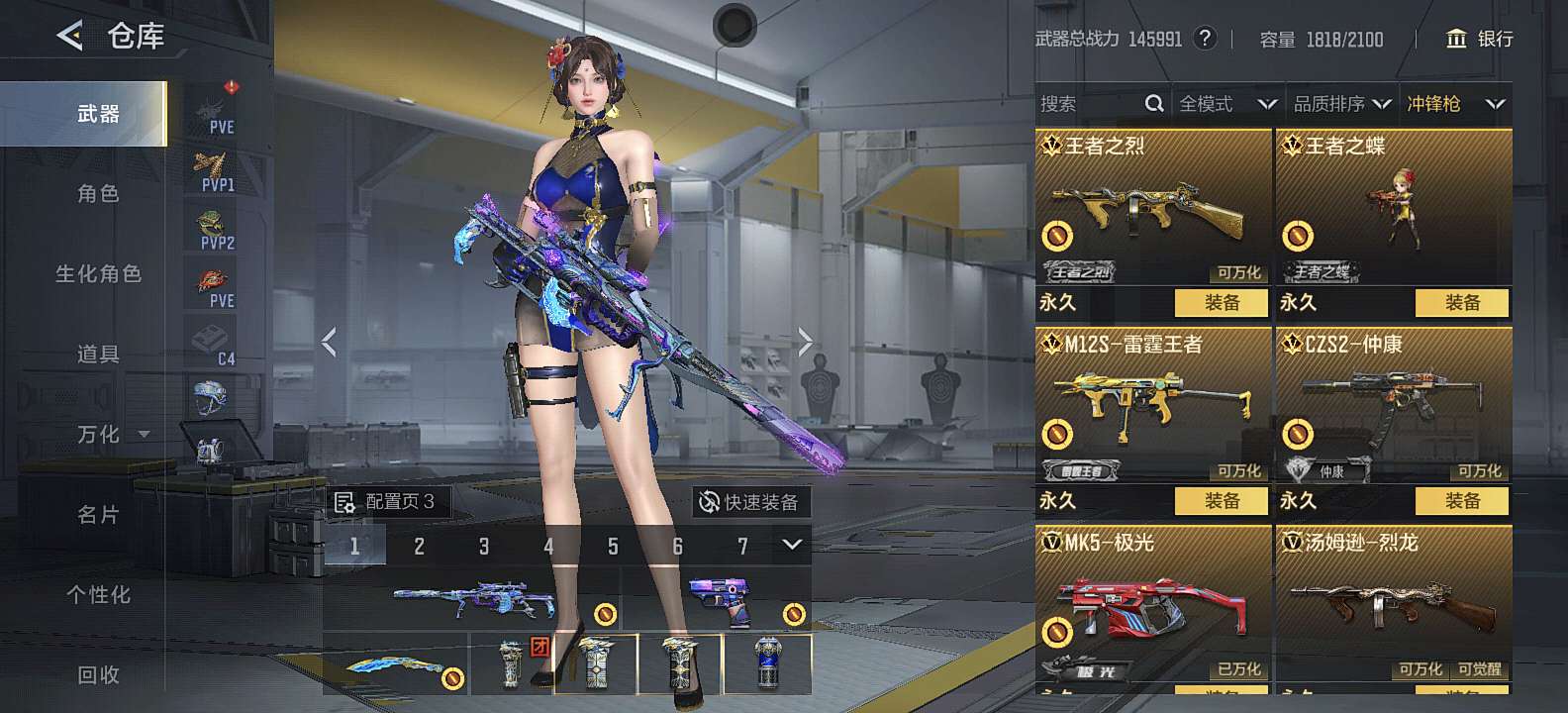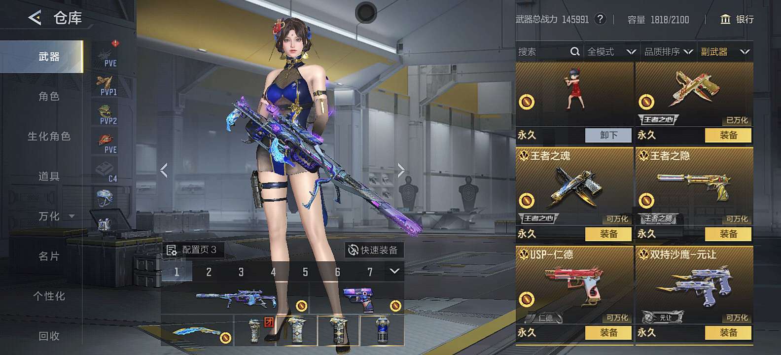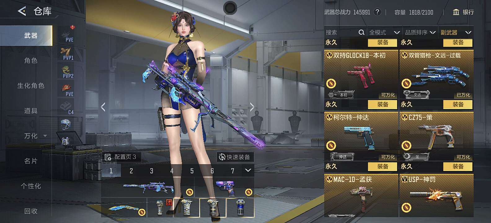 三国武器基本上都有,狙击满配 自己一手号充了三万多,8把cop,可小刀