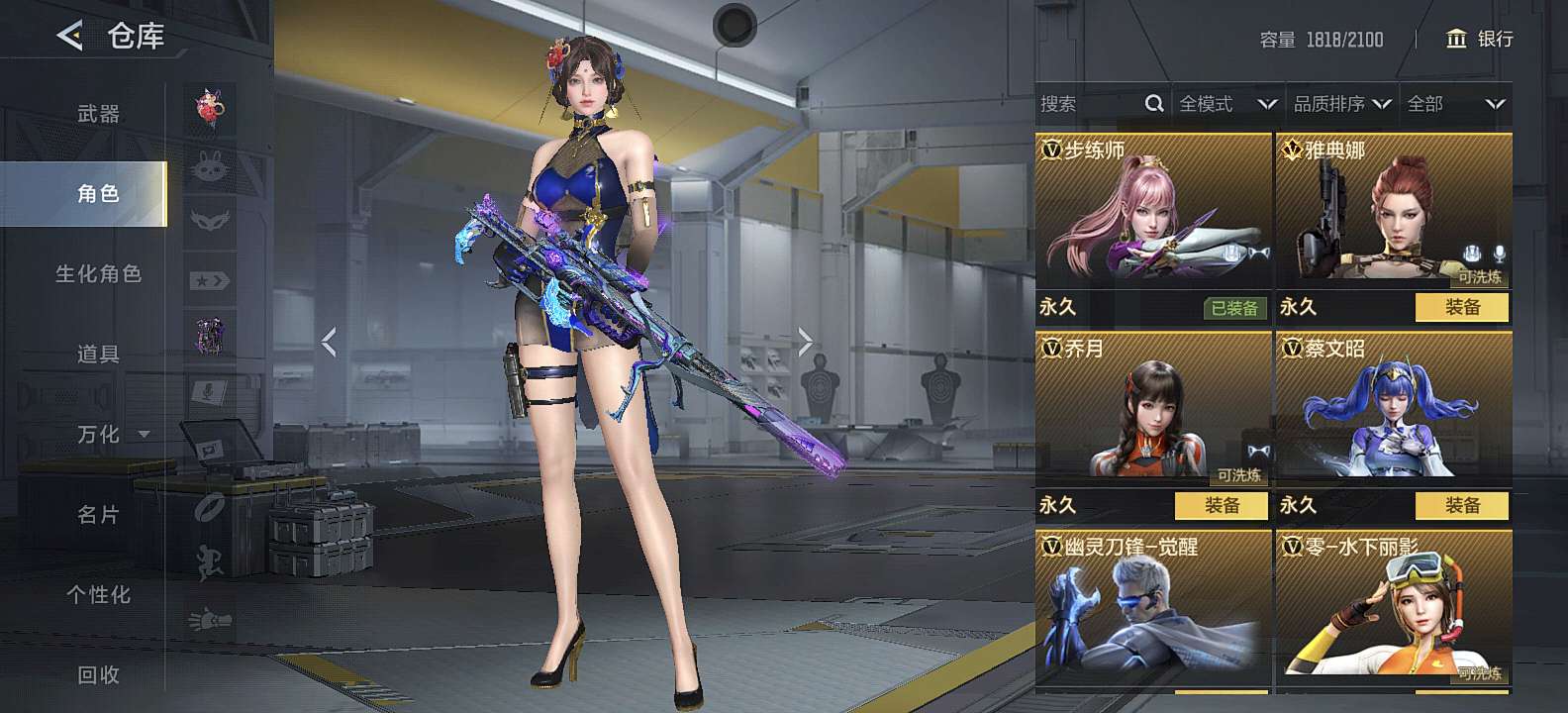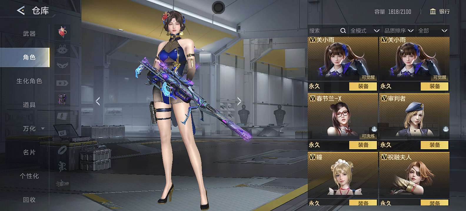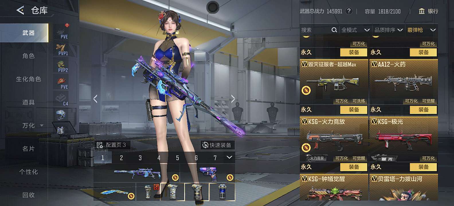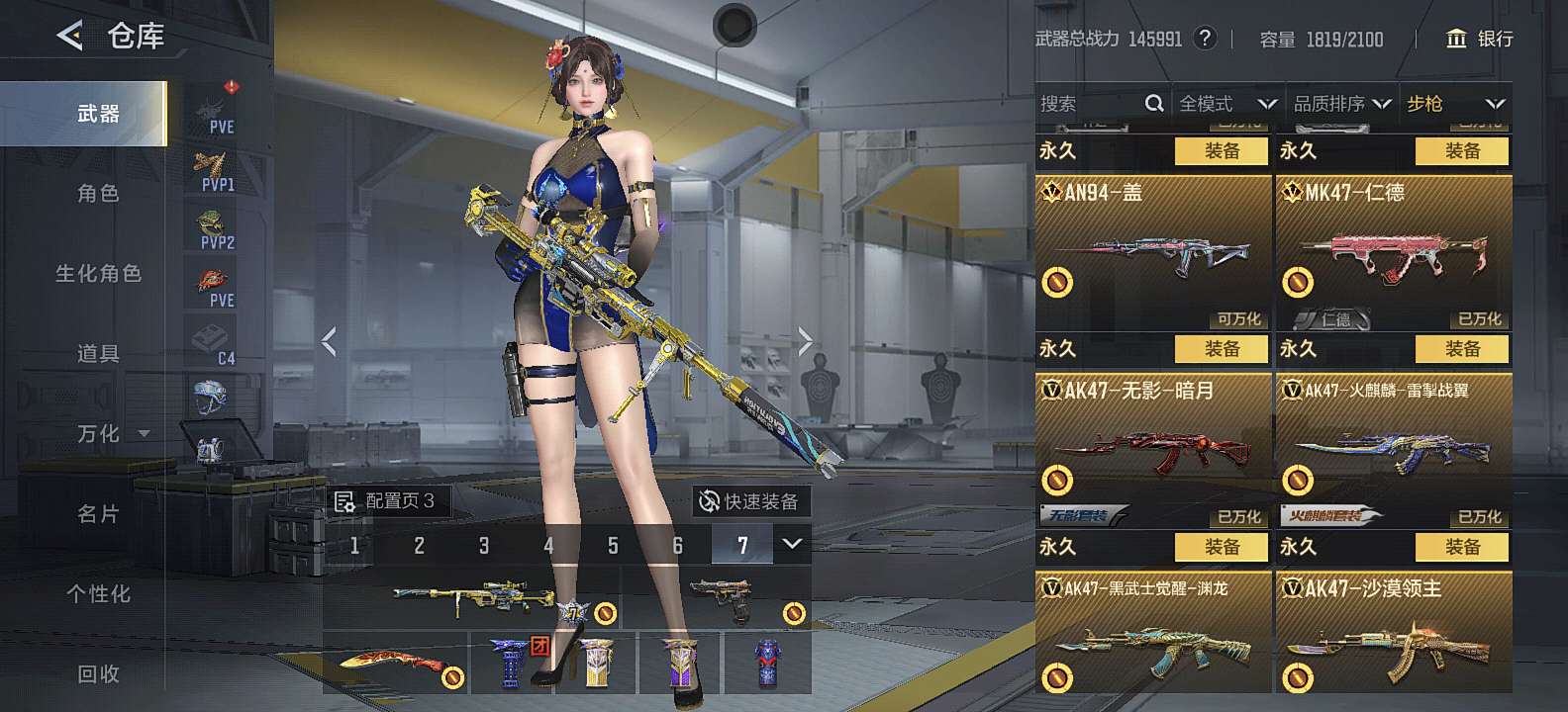 三国武器基本上都有,狙击满配 自己一手号充了三万多,8把cop,可小刀