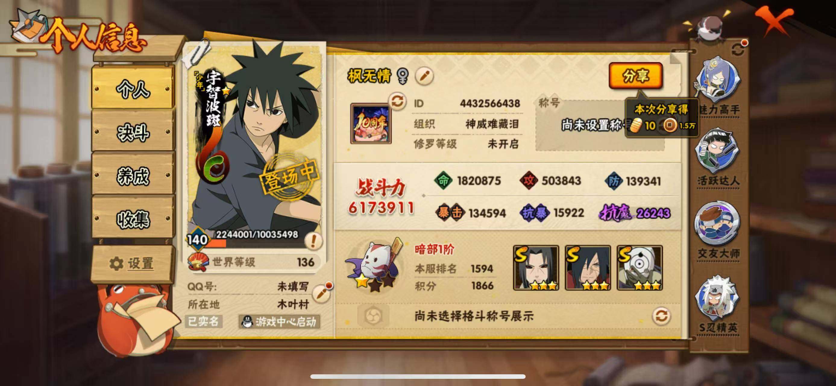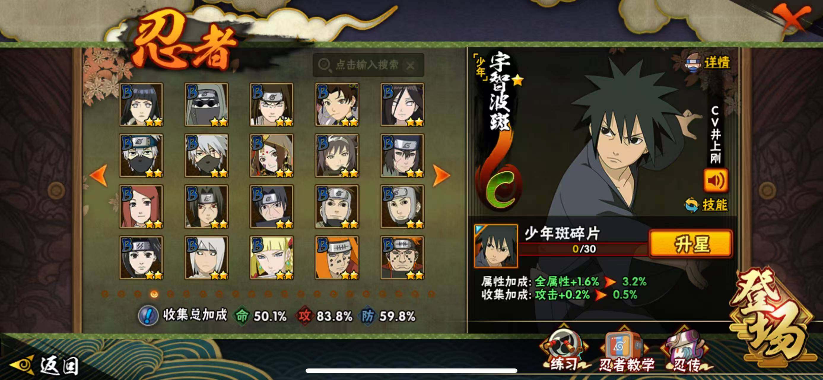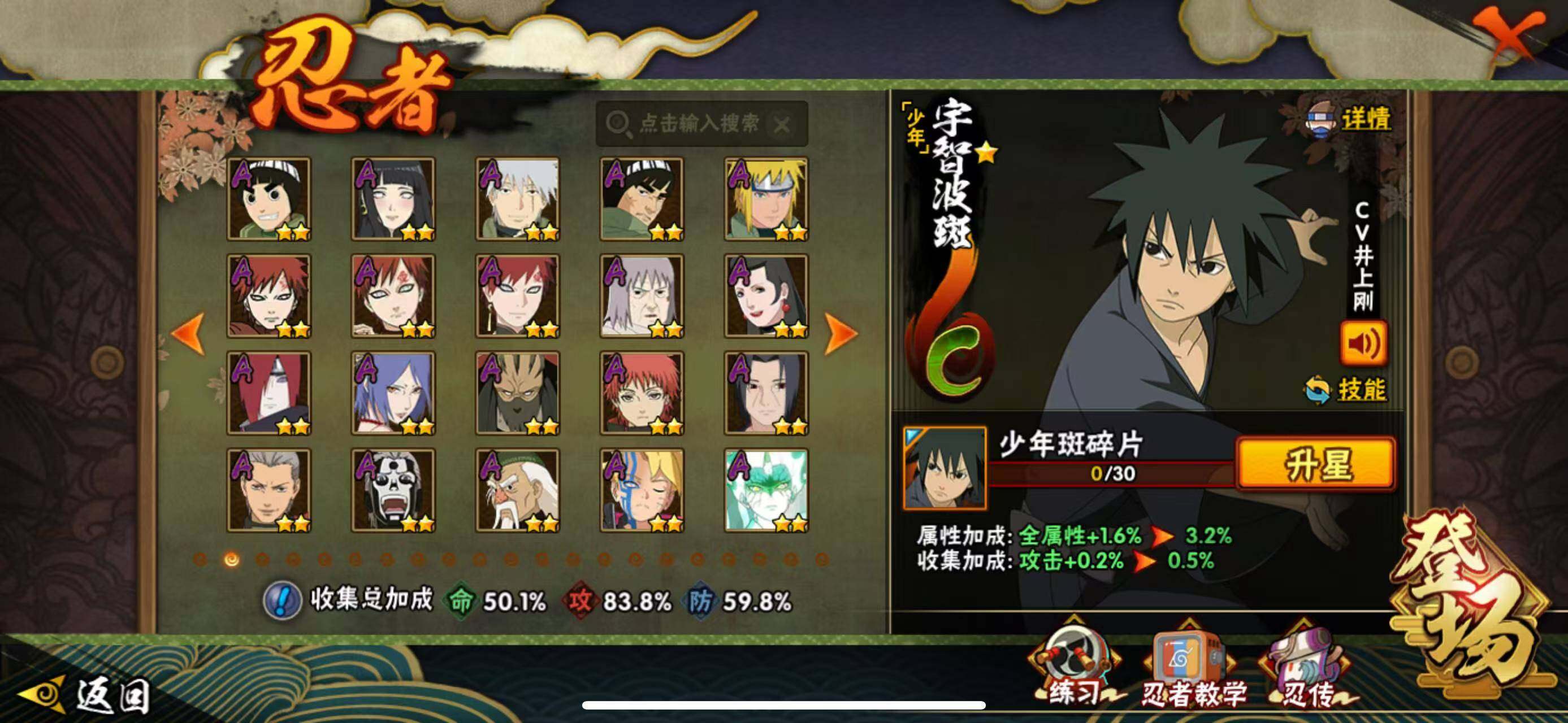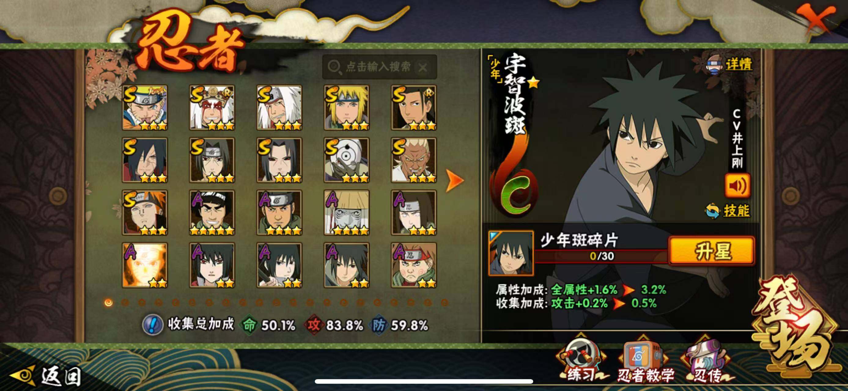 【S级忍者】:宇智波鼬「秽土转生」(3星),宇智波斑「秽土转生·解」(3星),艾「忍界大战」(3星),宇智波鼬「须佐能乎」(3星),千手柱间「木叶创立」(3星),自来也「舞之豪杰」(3星),自来也「传说中的三忍」(3星),波风水门(3星),佩恩「天道」(3星),宇智波斑 「白面具」(3星宇智波斑「白面具」),漩涡鸣人·宇智波佐助(3星)