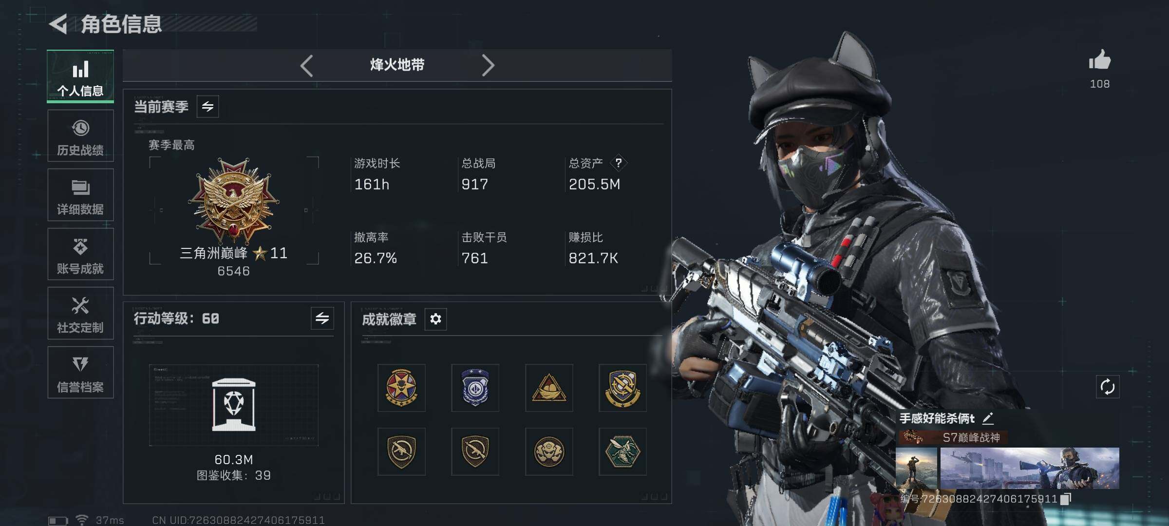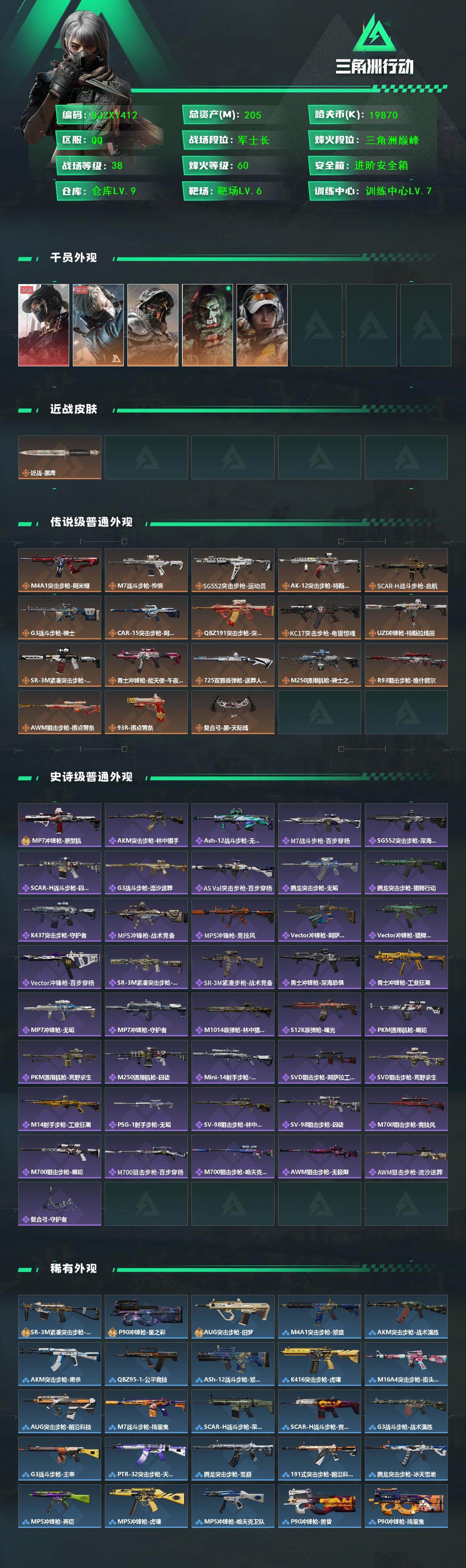 【SJZX1412】总资产(M):205M/哈夫币(K):19870K/哈夫币(K):19870K/传说枪皮数:18/全面战场等级:38_段位:军士长/烽火地带等级:60_段位:三角洲巅峰/露娜-黑·天际线/蜂医-送葬人·无题密令/深蓝-不破誓约/红狼-电锯惊魂/露娜-金牌射手/近战-黑鹰/M4A1突击步枪-阿米娅/M7战斗步枪-怜悯/SG552突击步枪-运动员/AK-12突击步枪-特斯拉线圈/SCAR-H战斗步枪-启航/G3战斗步枪-骑士/CAR-15突击步枪-阿米娅/腾龙突击步枪-捞点薯条/