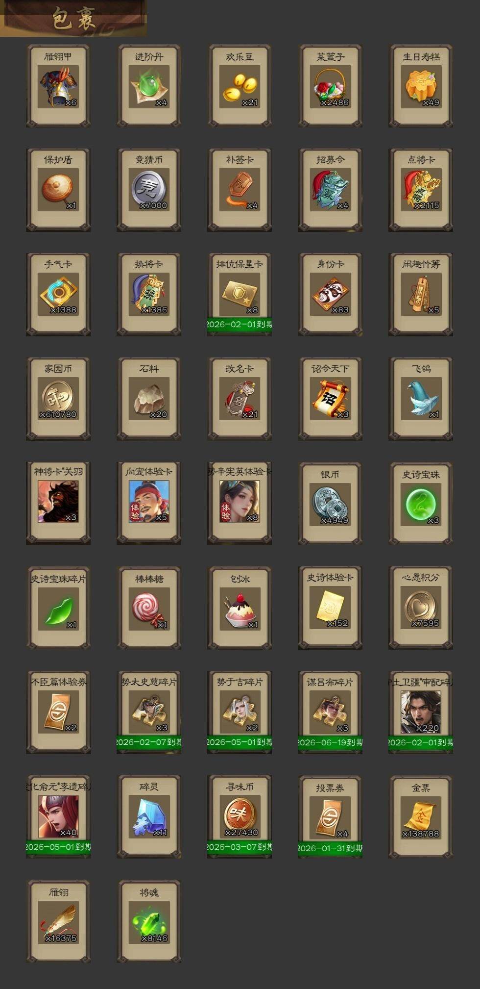 官阶:大将军;VIP等级:VIP9;史诗武将数量:35;动态皮肤数量:27;武将总数:344;史诗宝珠数量:3;将魂数量:8146;神将:6;魏国史诗武将:21;蜀国史诗武将:9;吴国史诗武将:3;群史诗武将:10