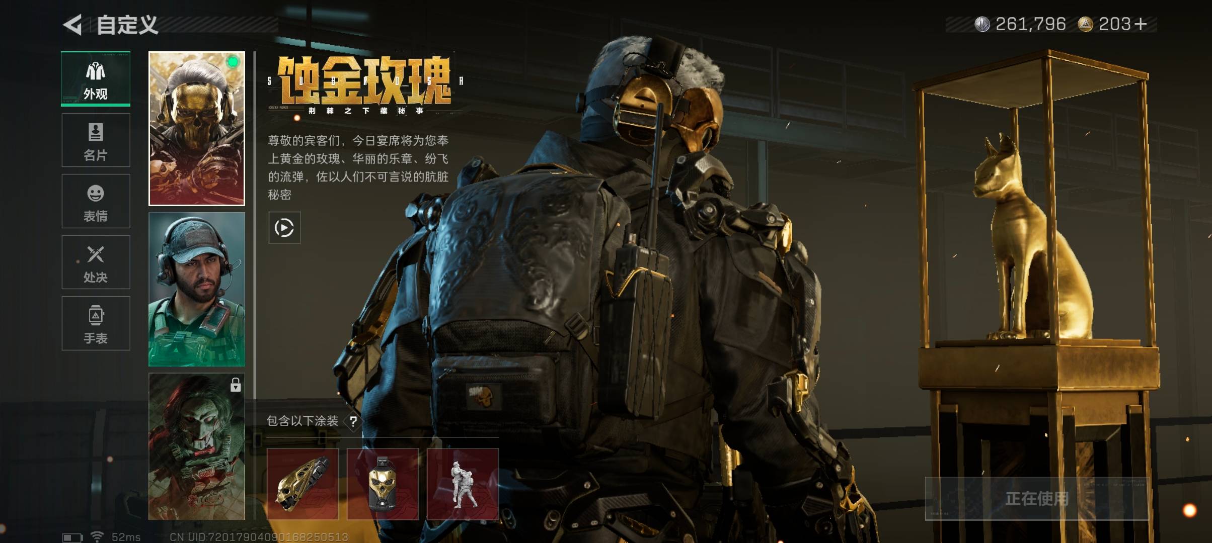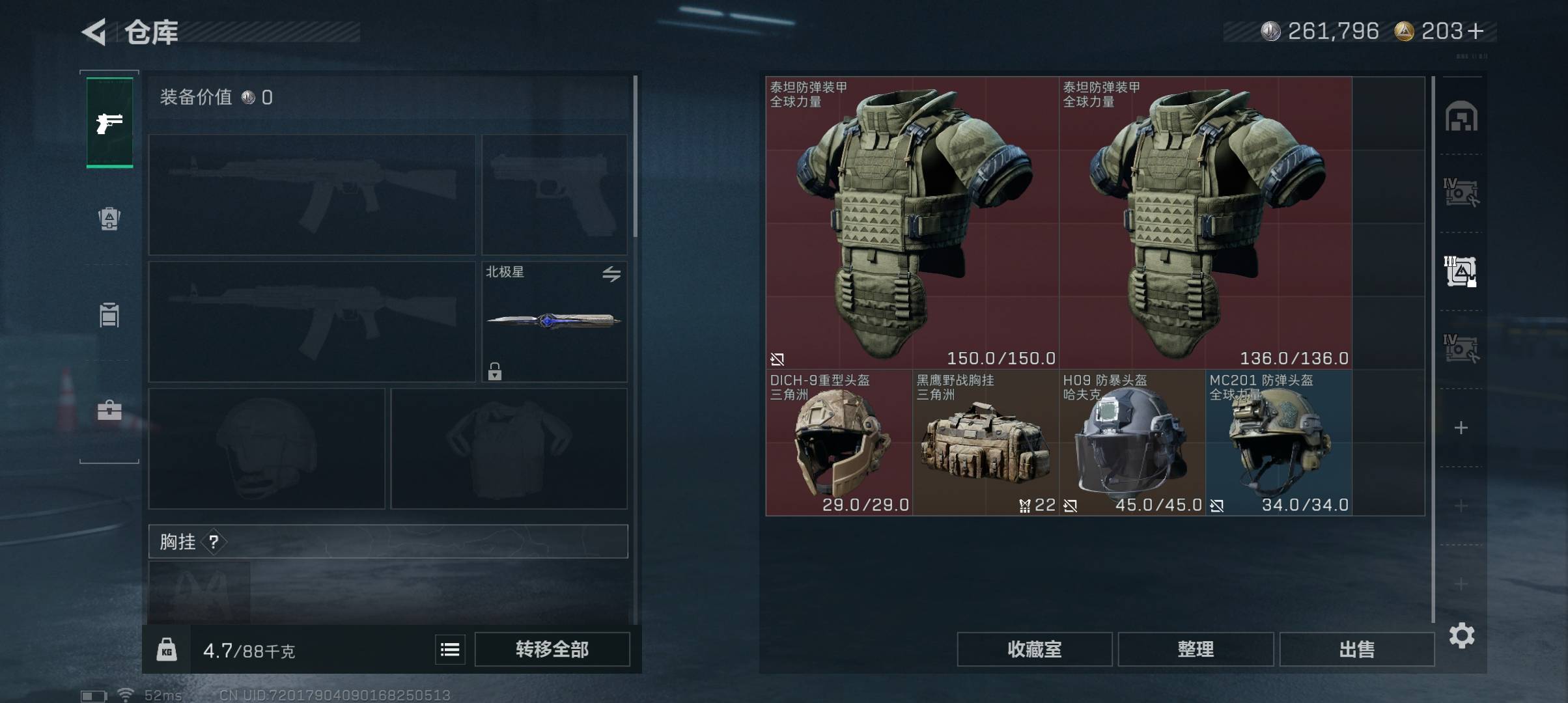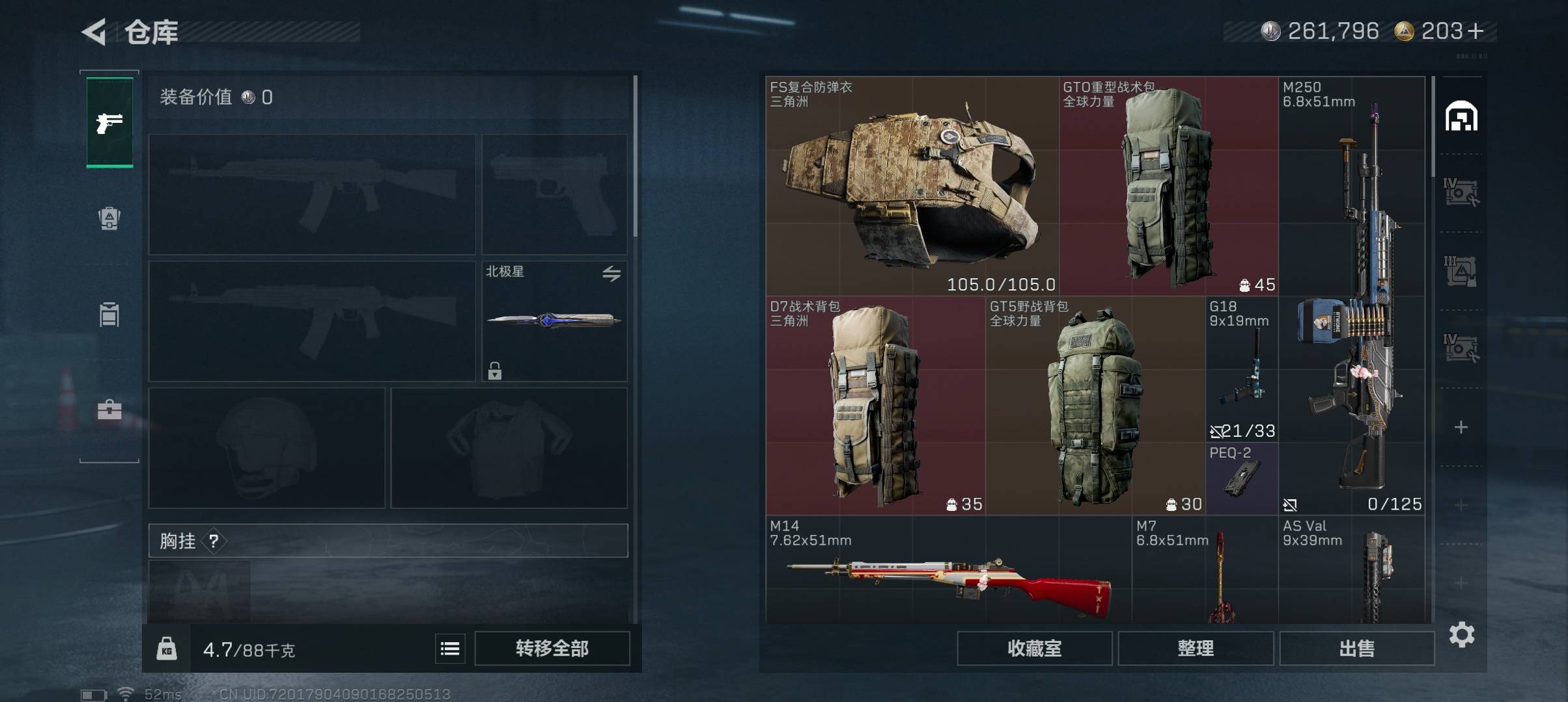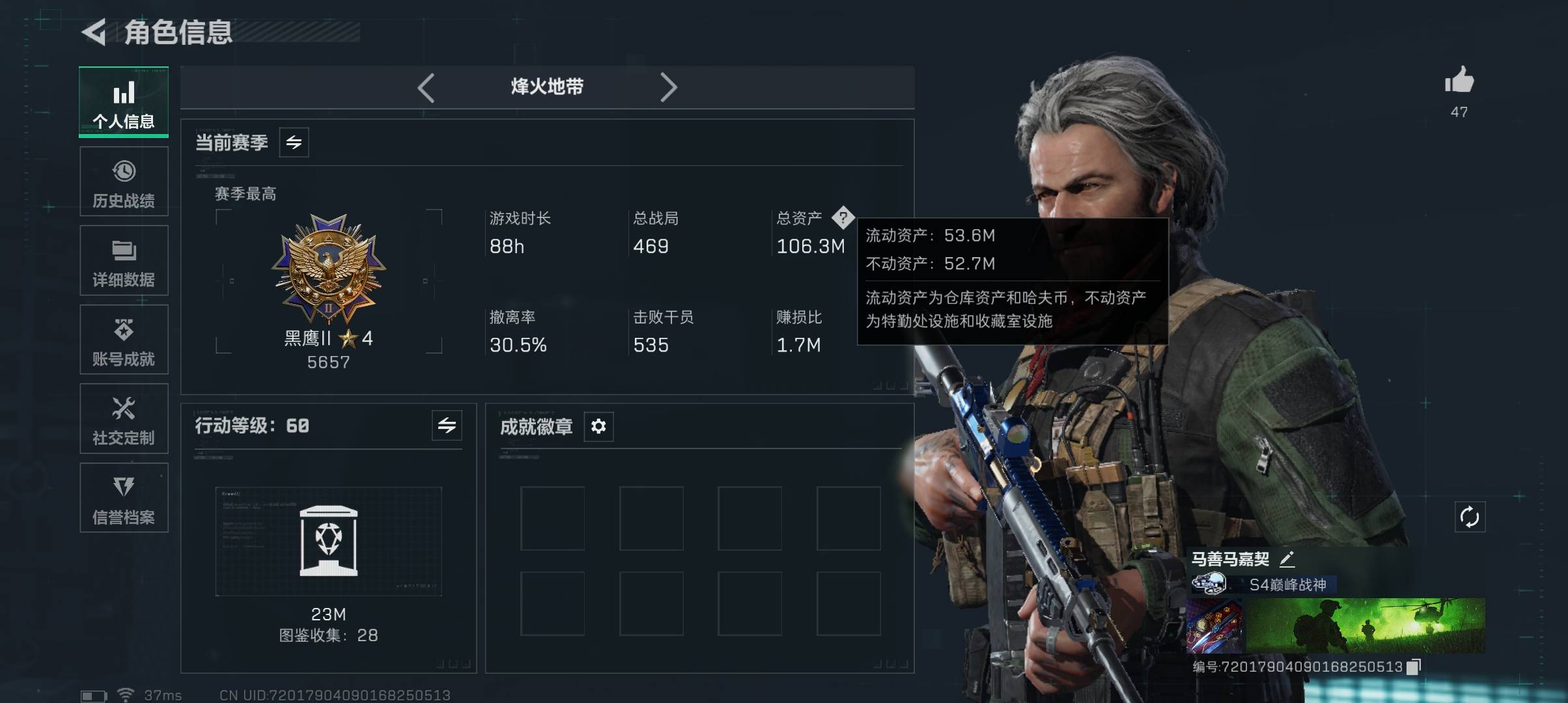 总资产106m 流动资产53m 哈夫币261k 1近战皮 1干员皮 高级安全箱 仓库lv9 训练中心