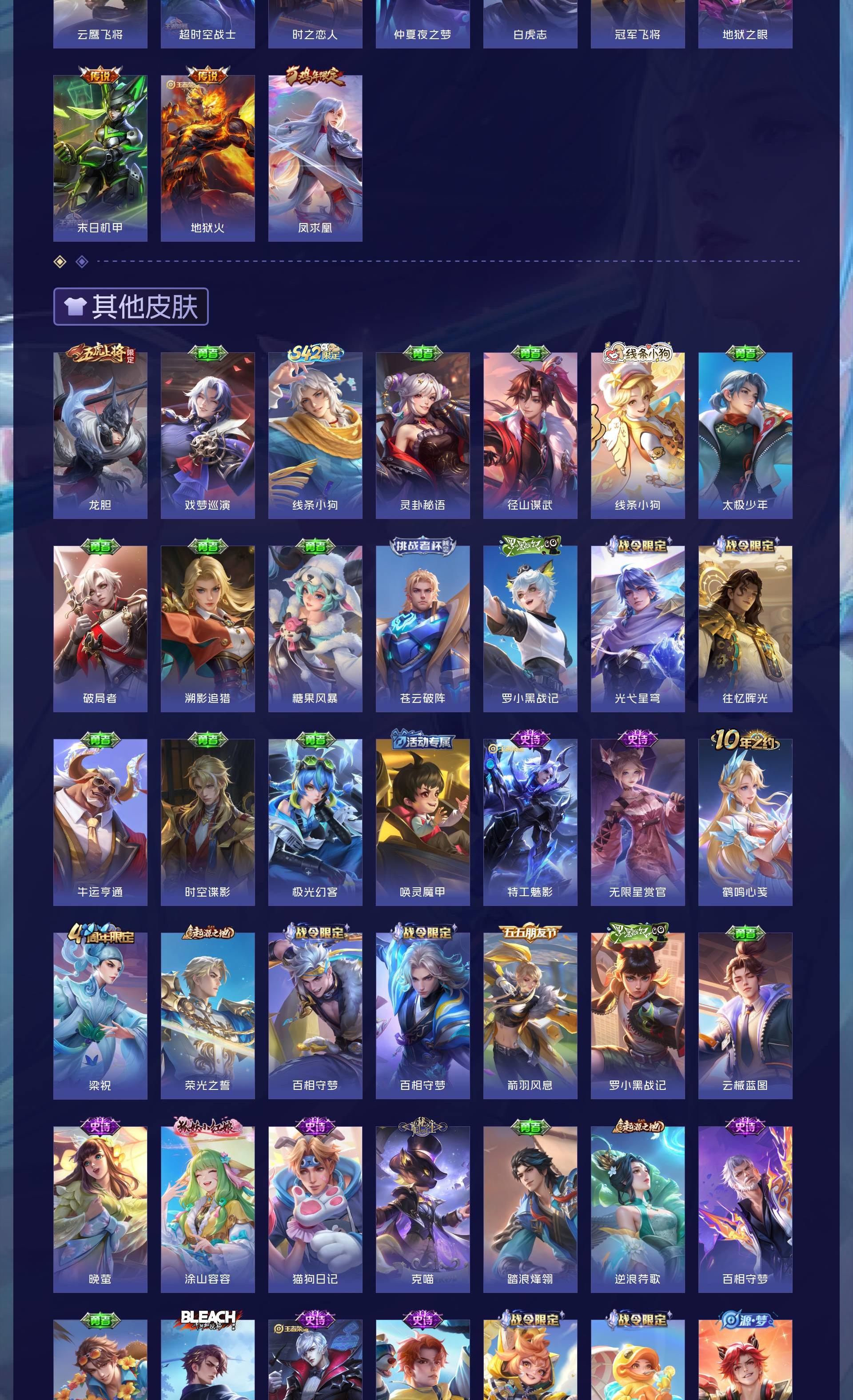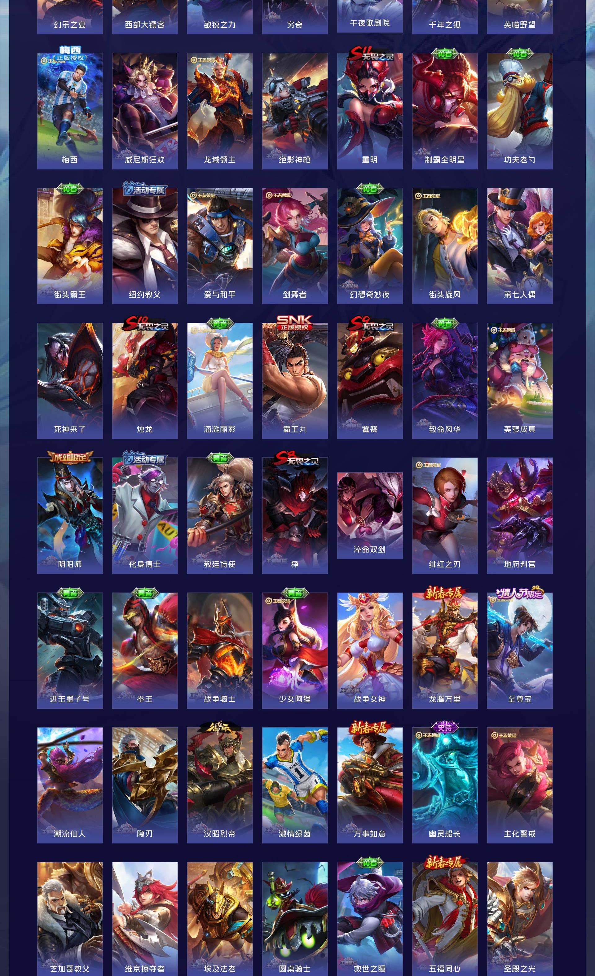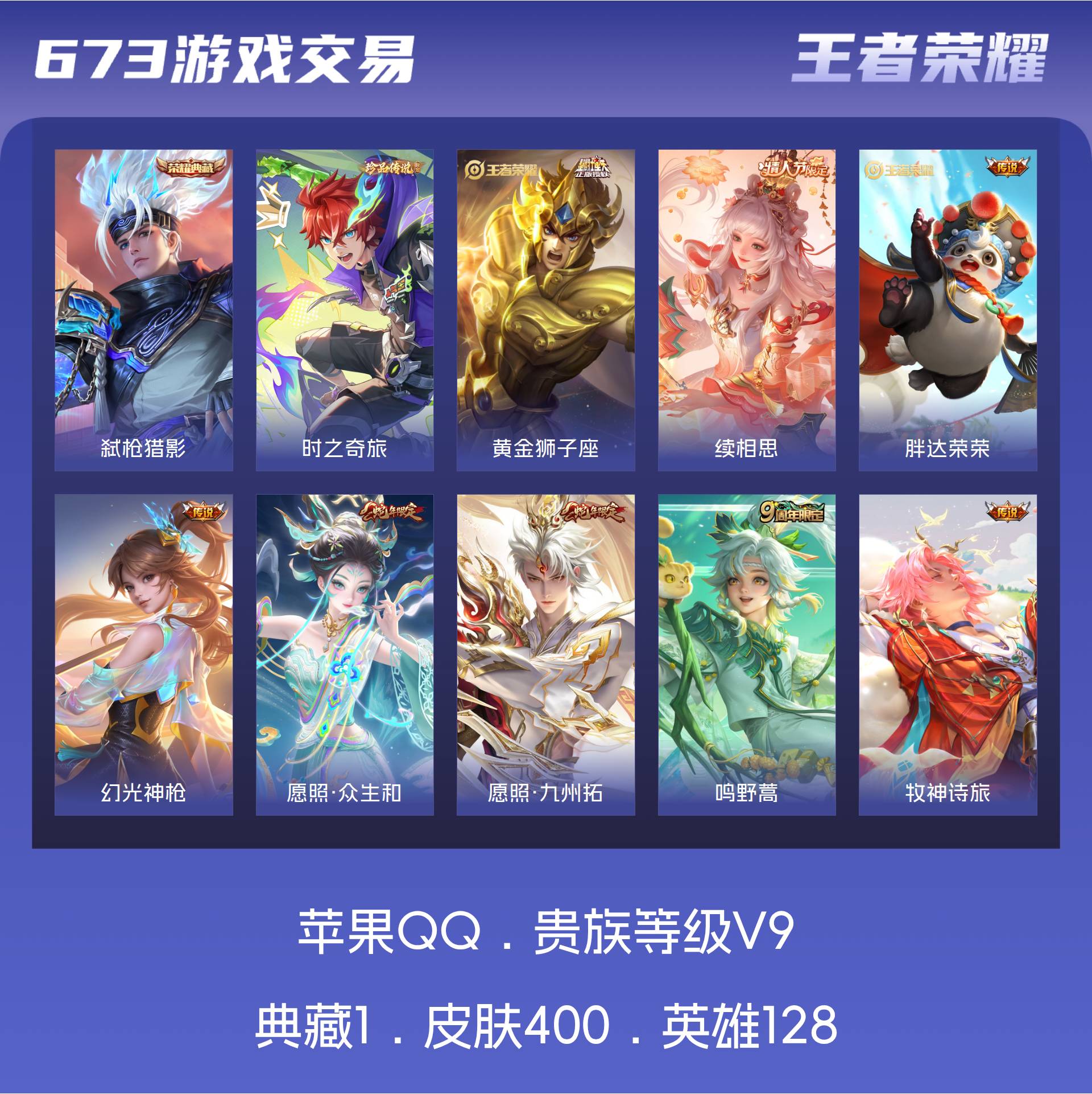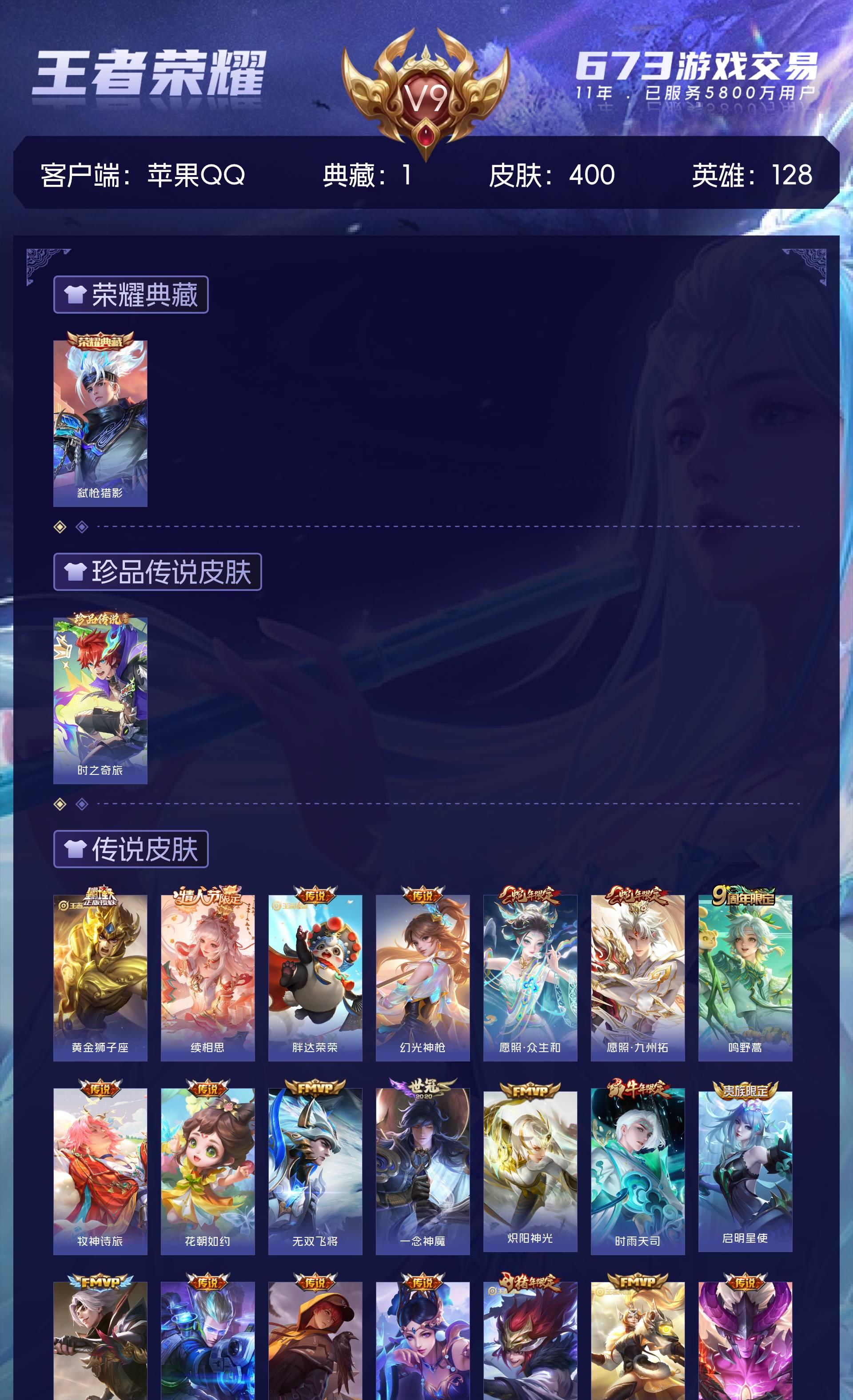 V9 皮肤400 英雄128 至尊星耀 荣耀典藏1 珍品传说1 星传说3 传说24 其他皮肤379