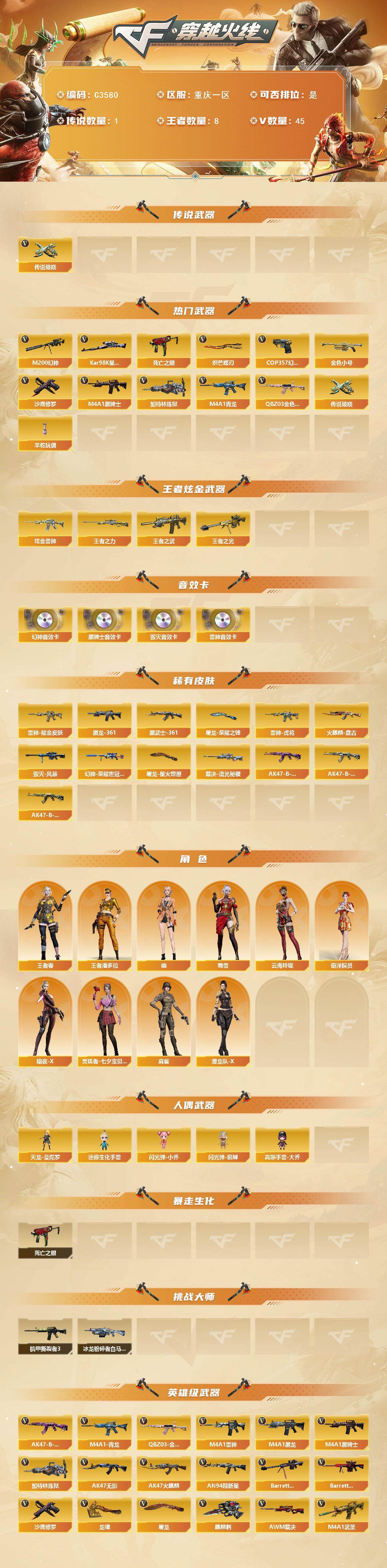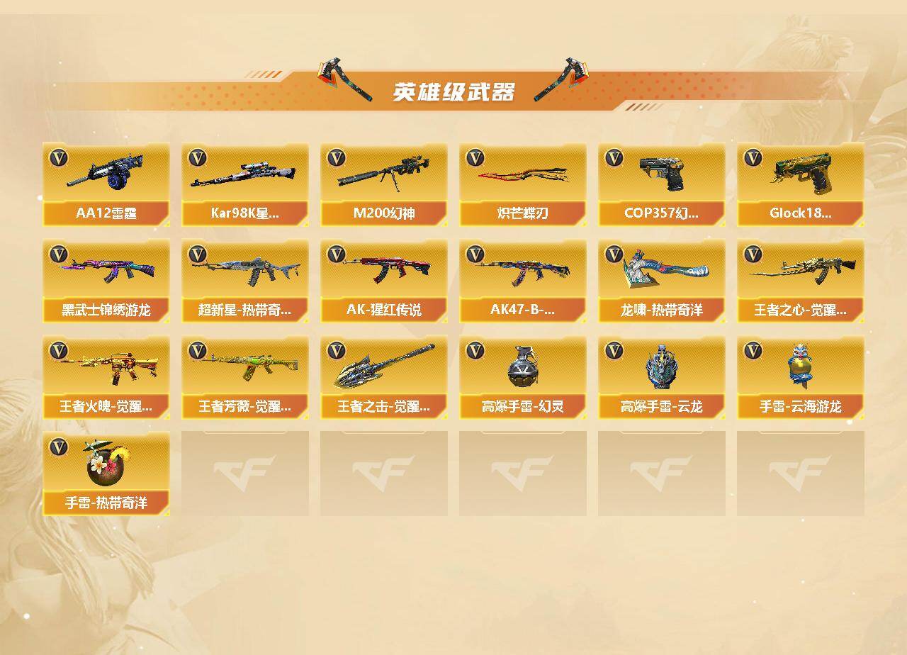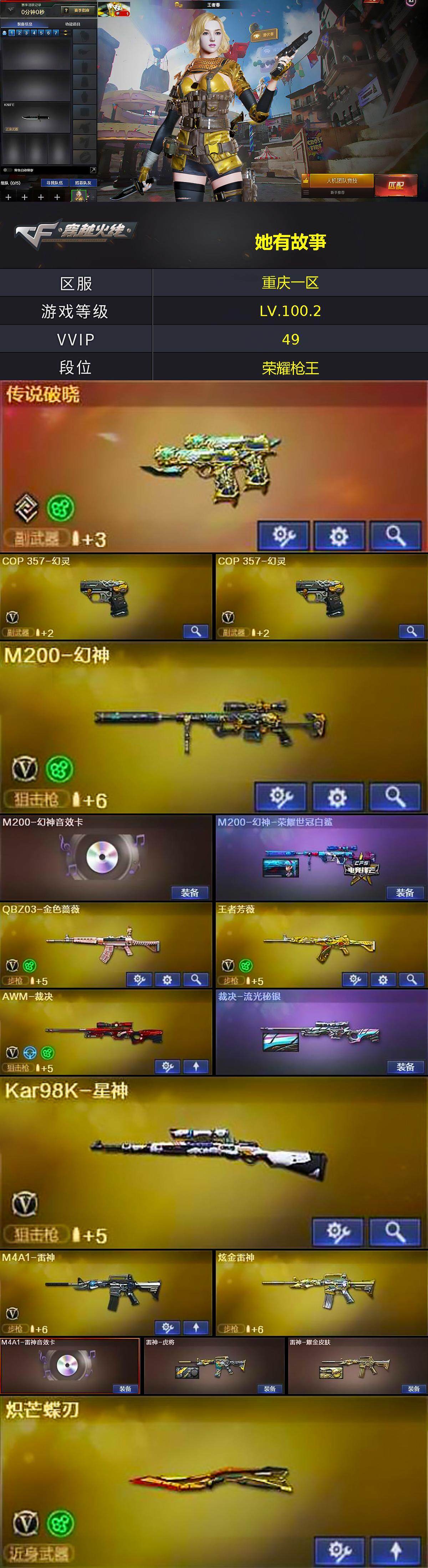 【热门武器】:传说破晓,QBZ03-金色蔷薇,M4A1-青龙,M200-幻神,死亡之眼,Kar98K-星神,金色小号,M4A1-黑骑士*2,加特林-炼狱,羊驼玩偶,COP 357-幻灵*2,沙鹰-修罗*5,炽芒蝶刃