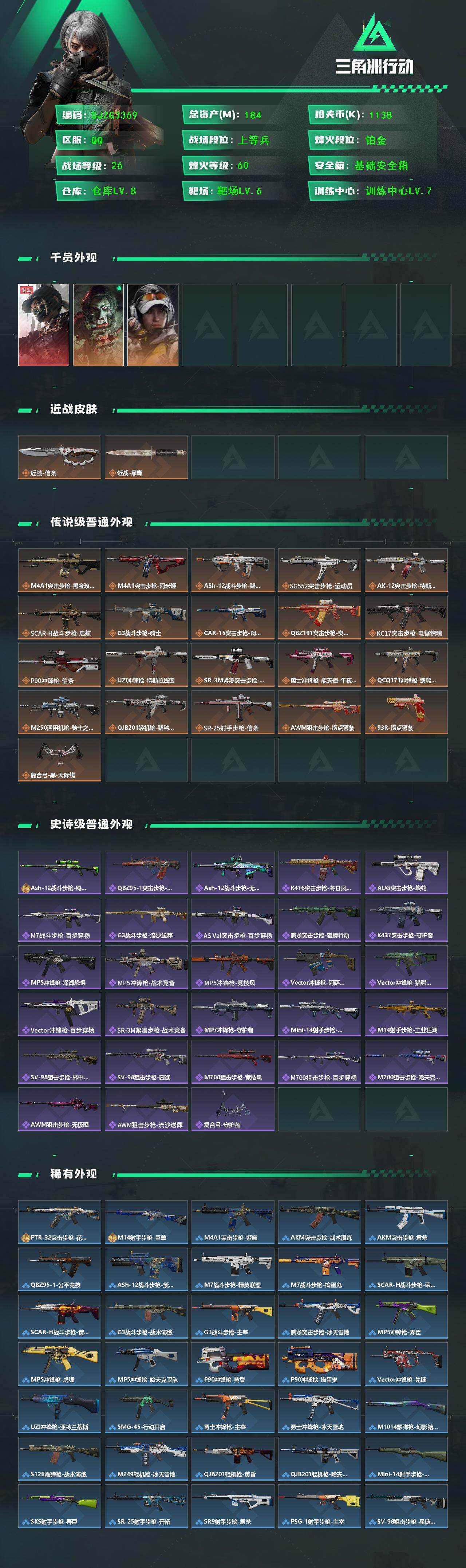 【SJZG3369】总资产(M):184M/哈夫币(K):1138K/哈夫币(K):1138K/传说枪皮数:21/全面战场等级:26_段位:上等兵/烽火地带等级:60_段位:铂金/露娜-黑·天际线/红狼-电锯惊魂/露娜-金牌射手/近战-信条/近战-黑鹰/鹅鸭杀捆绑包/特斯拉线圈捆绑包/捞点薯条捆绑包/信条捆绑包/M4A1突击步枪-蚀金玫瑰/M4A1突击步枪-阿米娅/ASh-12战斗步枪-鹅鸭杀/SG552突击步枪-运动员/AK-12突击步枪-特斯拉线圈/SCAR-H战斗步枪-启航/G3战斗步枪-