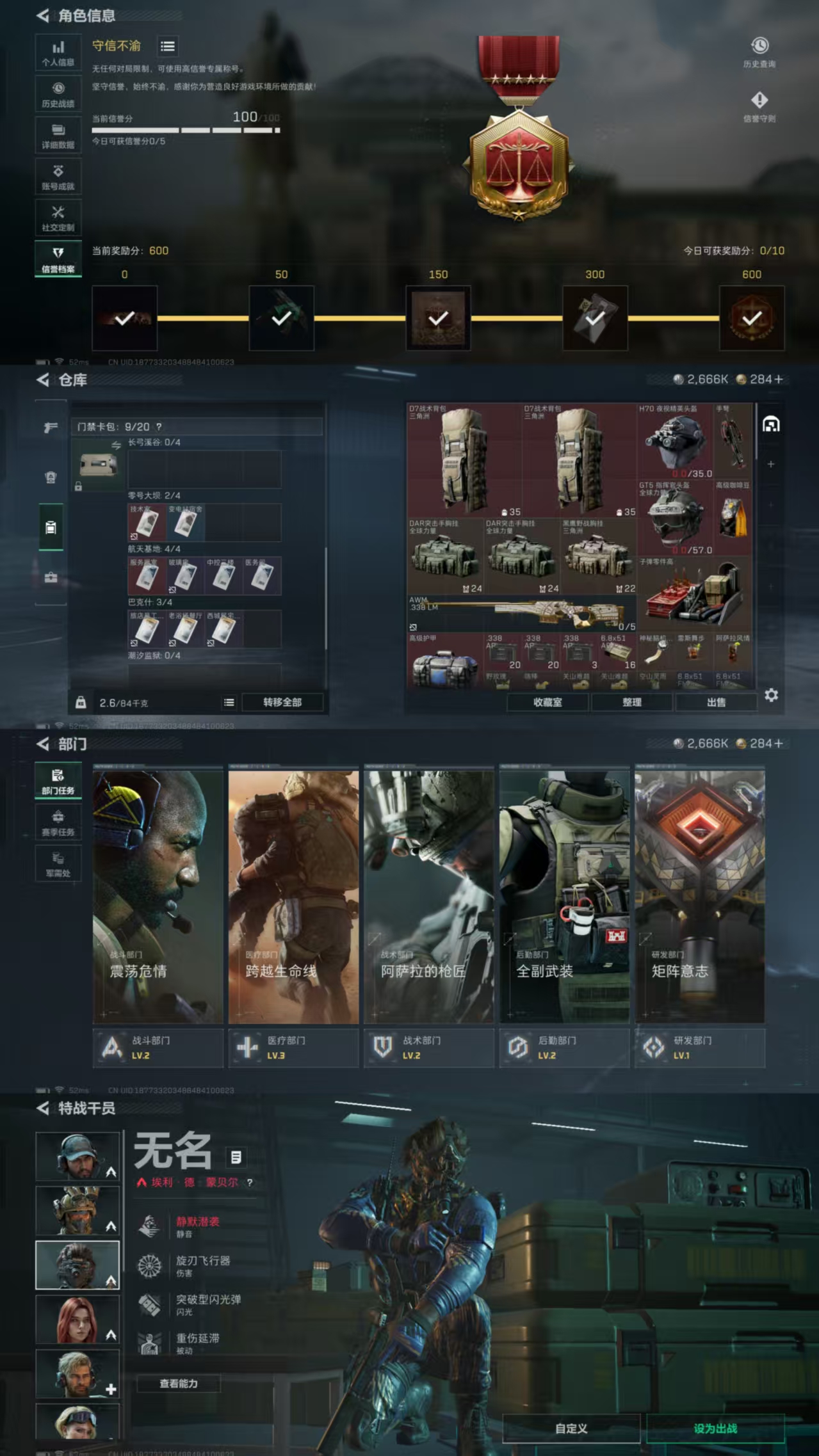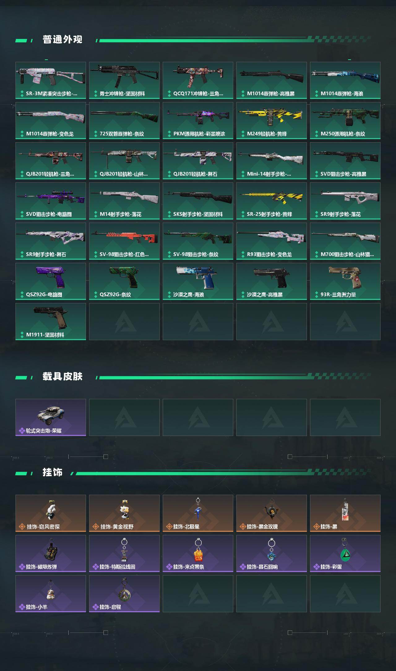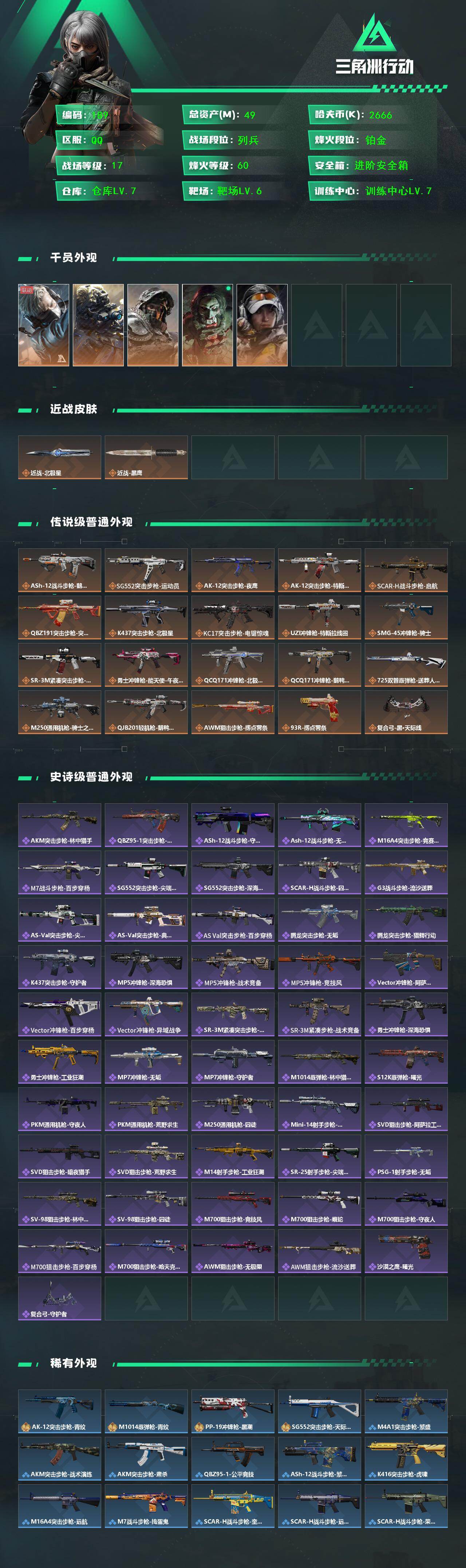 XXSJZ1881【5干员北极星 带王者117英雄 117皮肤 V5 7传说】三端互通-总价值49.15M-哈夫币2,666.8-烽火地带等级17-烽火地带段位黄金【干员皮肤】蜂医-送葬人·无题密令 深蓝-不破誓约 红狼-电锯惊魂 露娜-金牌射手 无名-夜鹰【近战武器】黑鹰 北极星【枪皮】M4A1突击步枪-猛兽 AK-12突击步枪-青纹 SG552突击步枪-天际线 M4A1突击步枪-粉色涂装 M4A1突击步枪-高雅黑 M4A1突击步枪-海色 M4A1突击步枪-繁盛 AKM突击步枪-彩墨喷涂 AK