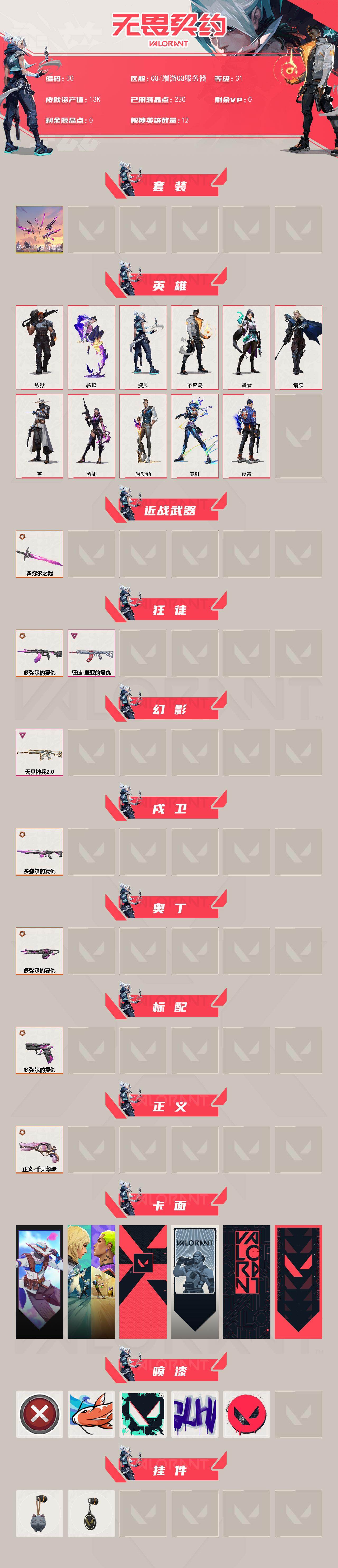 WLWW534【上手即玩!多弥尔的复仇套 盖亚的复仇狂徒】【游戏等级】Lv31 【段位】 未定级 【R点】230 【皮肤总价值】13,710 【英雄数量】12 【皮肤数量】20 【挂饰数量】21 【卡面数量】29 【喷漆数量】29 【近战武器】近战武器-碎心裂刃 近战武器-多弥尔之裁 【鬼魅】鬼魅-幻心猎手 【正义】正义-千灵华绽 正义-诛心猎手 【幻影】幻影-甜心猎手 幻影-天界神兵//2.0 【冥驹】冥驹-诛心猎手 【戍卫】戍卫-甜心猎手 戍卫-多弥尔的复仇 【狂徒】狂徒-幻心猎手 狂徒-