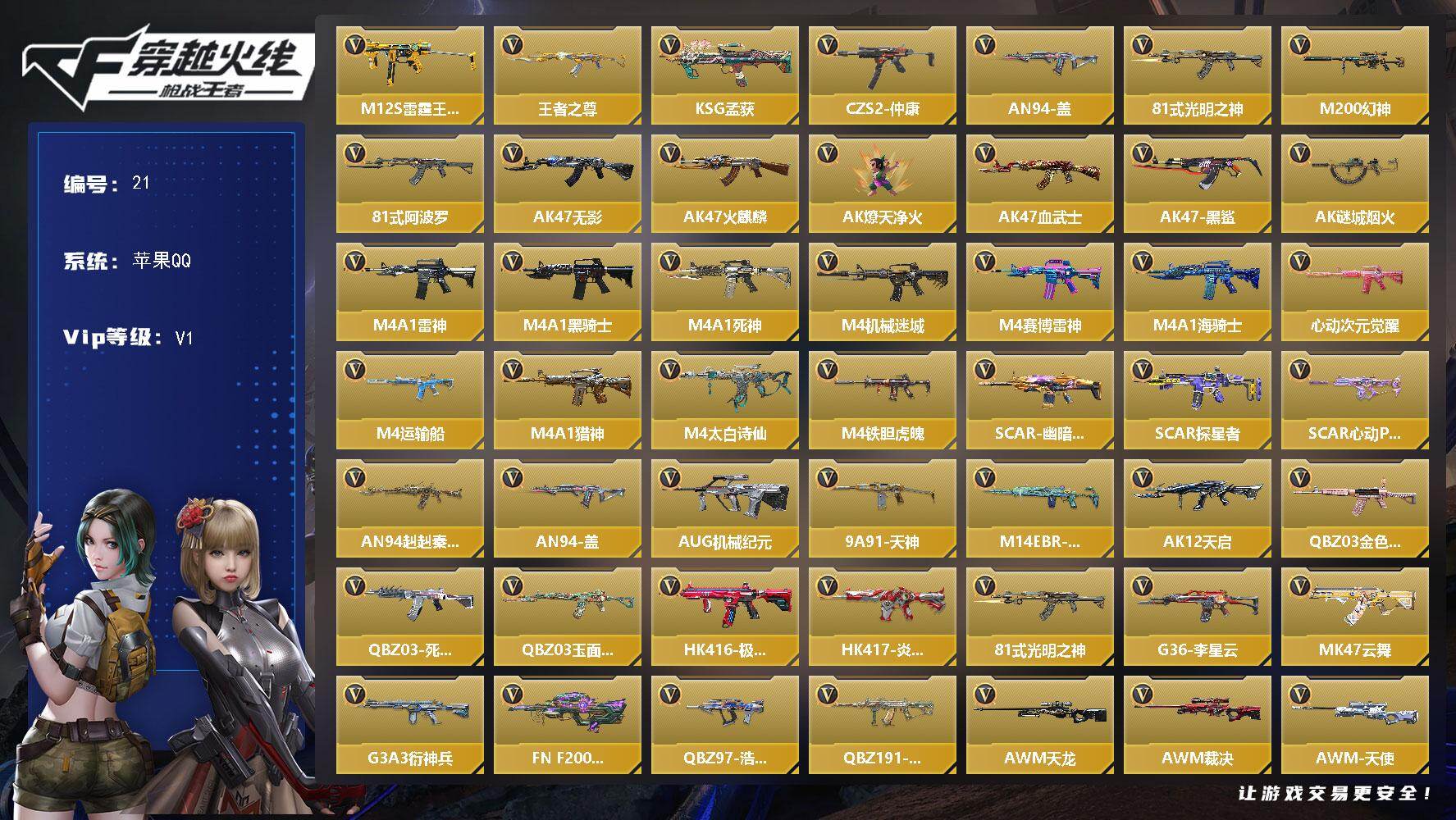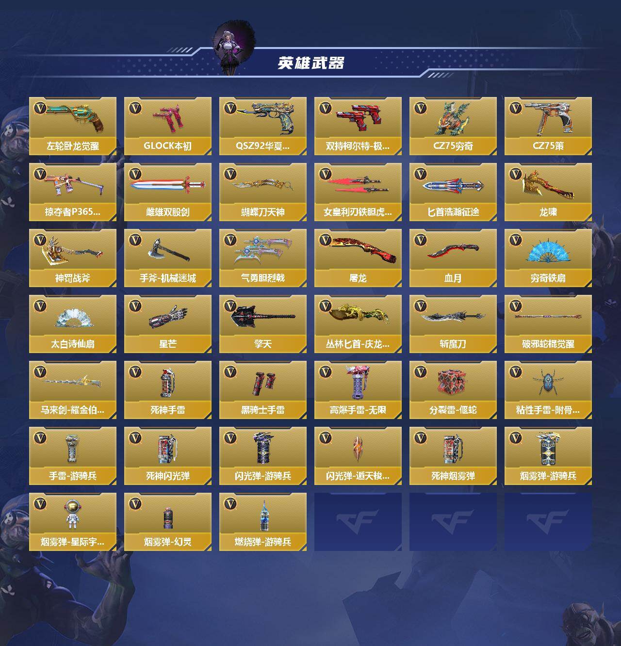 【金V武器】猎弩-虫族女王 AA12-火药 AN94-赳赳秦师 蝴蝶刀-天神 AK47-血武士 M4A1-太白诗仙 M4A1-雷神 CZS2-血月 SCAR-幽暗骑士觉醒 CZ75-策 MR1-幽暗骑士 AWM-指南针觉醒
