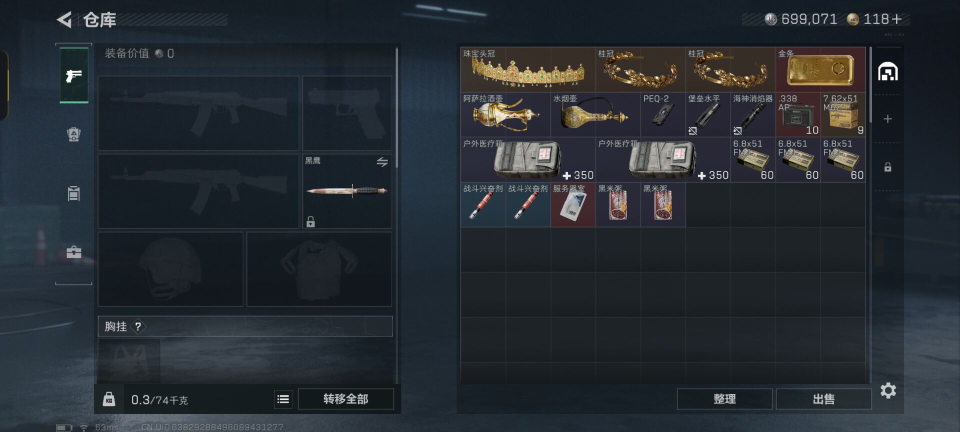 WLSJZ899三端互通-总价值4.06M-哈夫币699.07-烽火地带等级44-烽火地带段位铂金【近战武器】黑鹰【枪皮】AKM突击步枪-肃杀 QBZ95-1突击步枪-高雅黑 QBZ95-1突击步枪-2026 AKS-74U突击步枪-冰天雪地 K416突击步枪-高雅黑 M16A4突击步枪-高雅黑 M7战斗步枪-黑巧甜心 SG552突击步枪-2026 SCAR-H战斗步枪-荣耀列队 AS Val突击步枪-黑巧甜心 MP5冲锋枪-竞技风 P90冲锋枪-黑巧甜心 Vector冲锋枪-几何迷彩 Vect