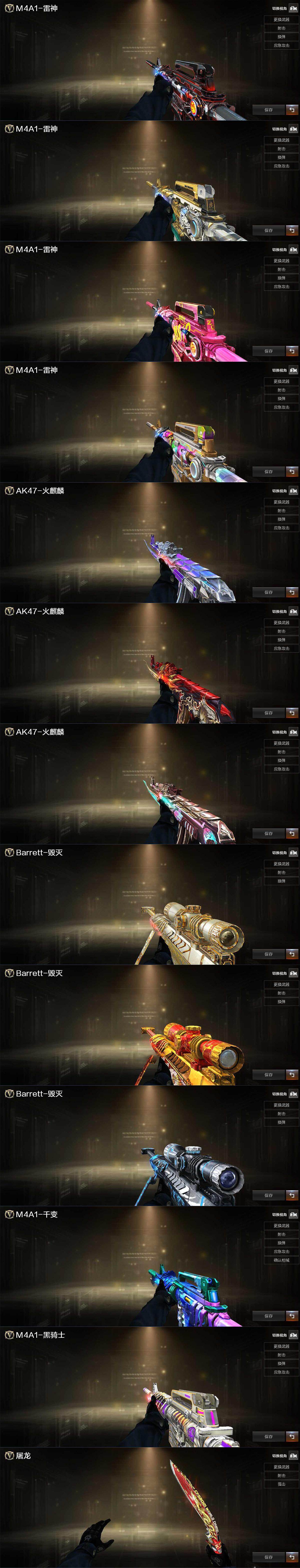 【音效卡】:AK47-火麒麟音效卡,M4A1-雷神音效卡,M4A1-黑骑士音效卡,Barrett-毁灭音效卡,Barrett-碧霄极光音效卡,AW