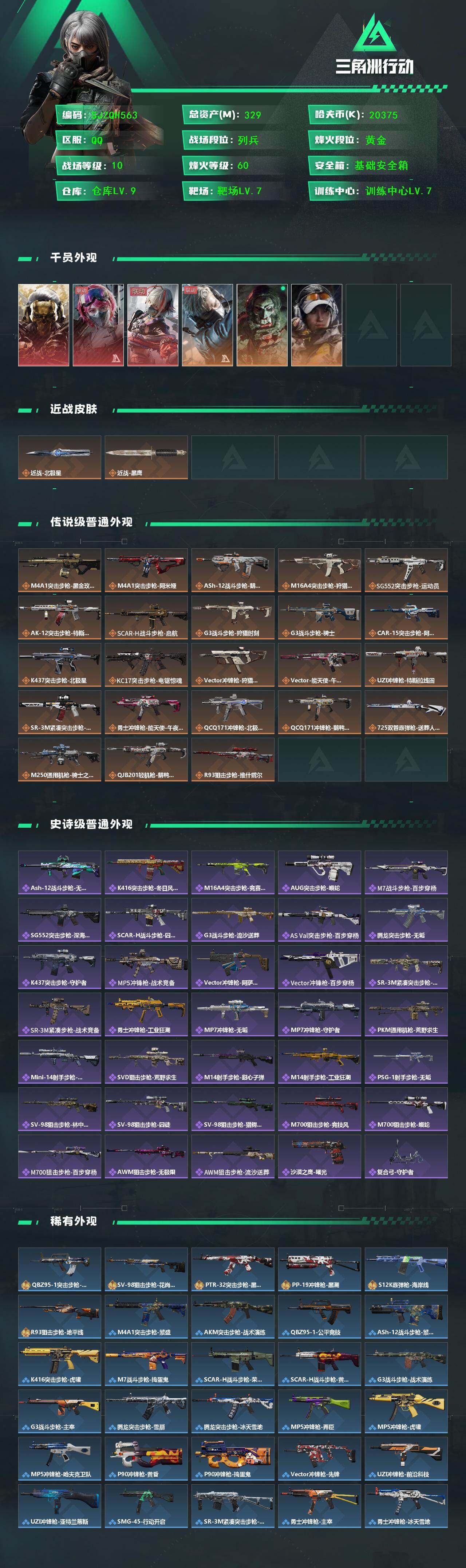 【SJZQH563】总资产(M):329M/哈夫币(K):20375K/哈夫币(K):20375K/传说枪皮数:23/全面战场等级:10_段位:列兵/烽火地带等级:60_段位:黄金/红狼-蚀金玫瑰/蛊-能天使午夜邮差/骇爪-维什戴尔/蜂医-送葬人·无题密令/红狼-电锯惊魂/露娜-金牌射手/近战-北极星/近战-黑鹰/M4A1突击步枪-蚀金玫瑰/M4A1突击步枪-阿米娅/ASh-12战斗步枪-鹅鸭杀/M16A4突击步枪-狩猎时刻/SG552突击步枪-运动员/AK-12突击步枪-特斯拉线圈/SCAR-