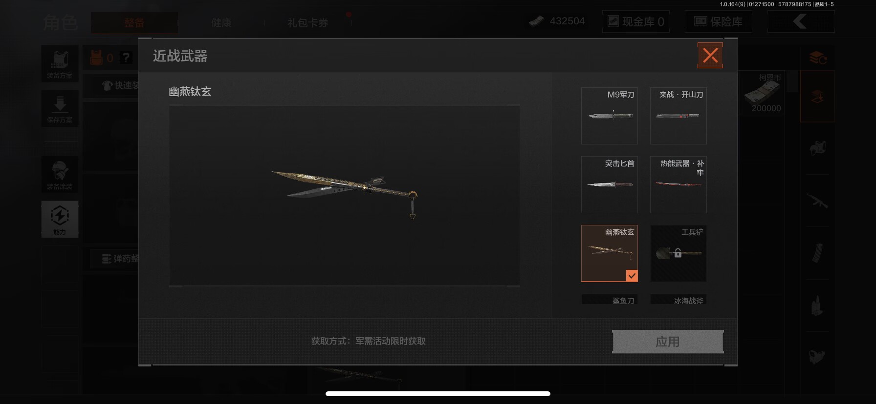 WLAQ548【4刀皮】苹果Q-等级30-仓库价值0-科恩币0-【套装】和平先锋作战套装 财团之手作战套装 鎏金街头套装 暴恐机动队·外勤服饰 都市夜影套装 街区守卫【近战武器】 突击匕首 幽燕钛玄 热能武器·补牢 来战·开山刀