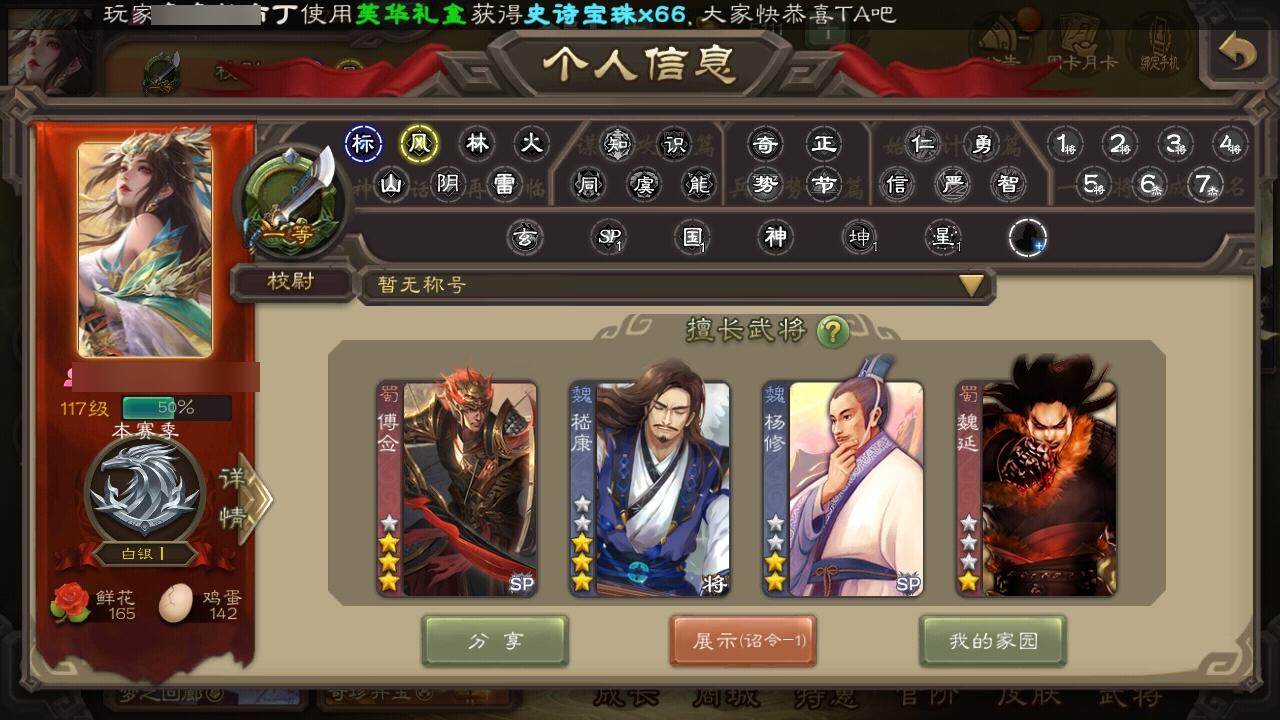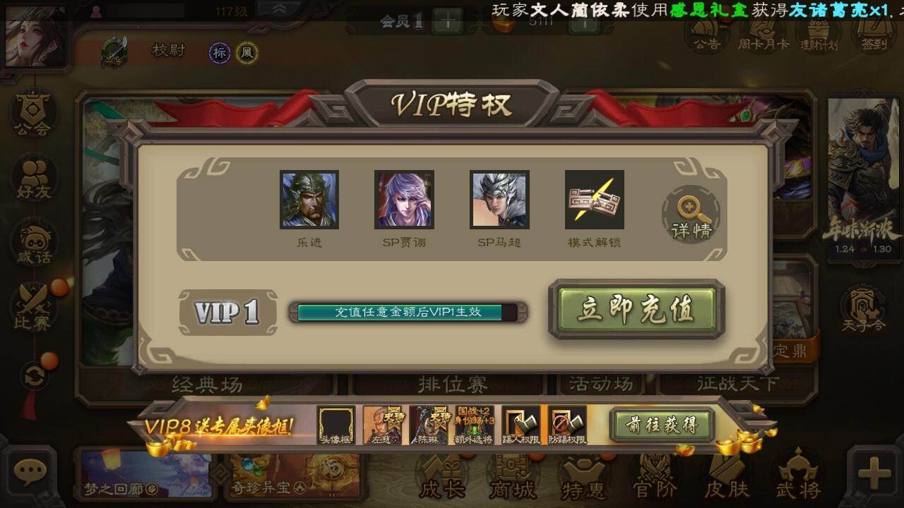 官阶:先锋将军;VIP等级:VIP1;史诗武将数量:3;动态皮肤数量:2;武将