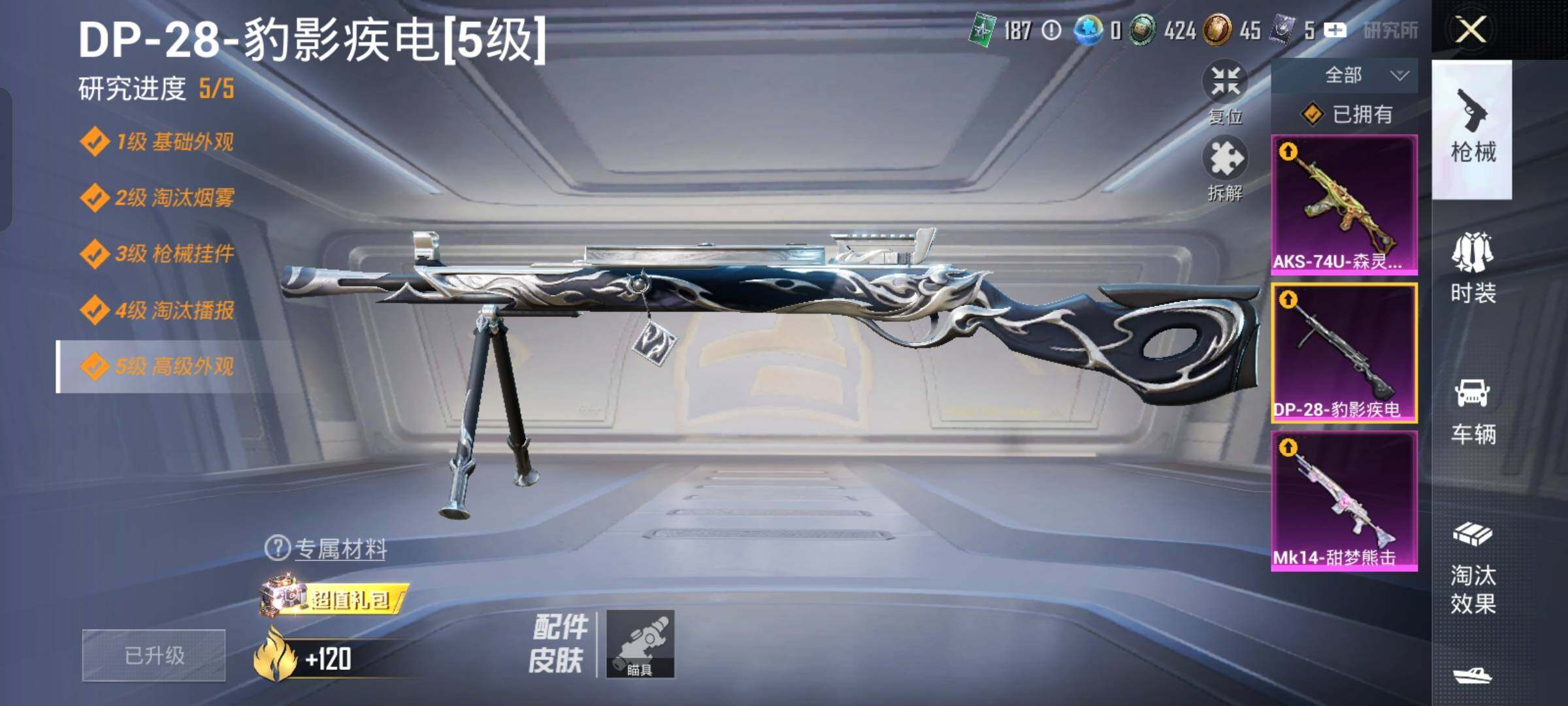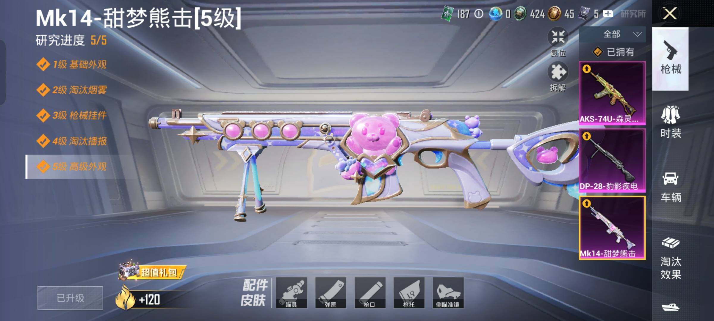 【3特效枪】 AKS-74U-森灵之息 (5级) DP-28-豹影疾电 (5级) Mk14-甜梦熊击 (5级)