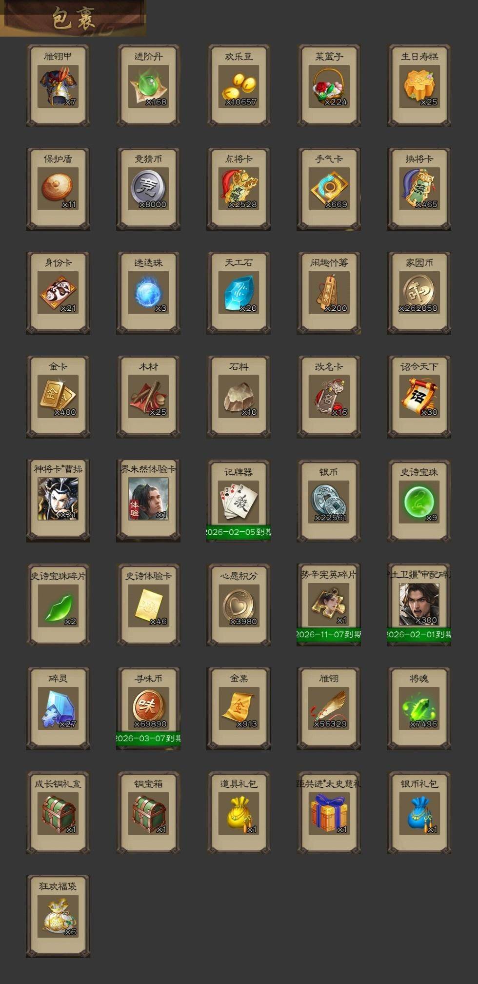 官阶:大将军;VIP等级:VIP10;史诗武将数量:33;动态皮肤数量:37;武将总数:350;史诗宝珠数量:9;将魂数量:7496;神将:5;魏国史诗武将:24;蜀国史诗武将:5;吴国史诗武将:5;群史诗武将:13