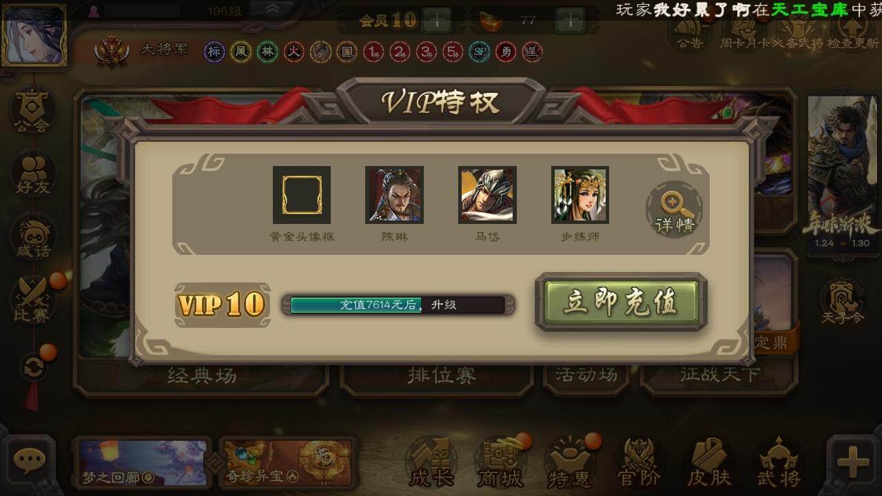 官阶:大将军;VIP等级:VIP10;史诗武将数量:33;动态皮肤数量:37;
