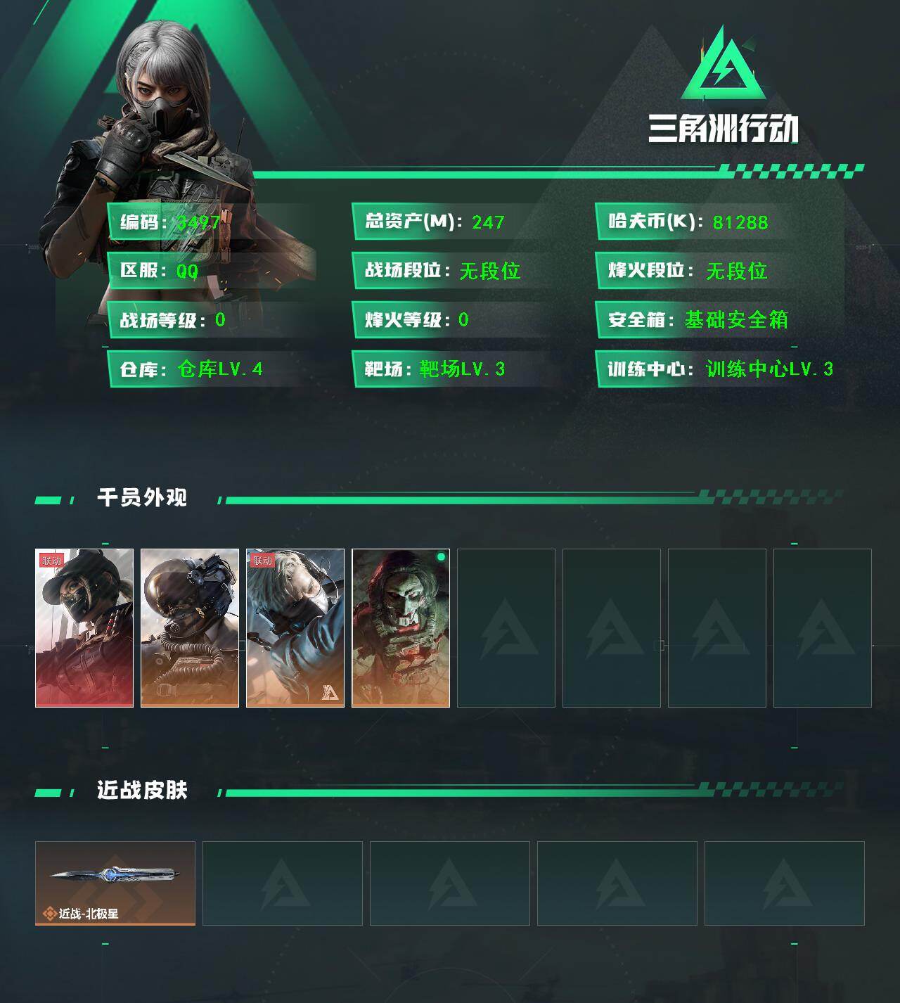 LJ4850总资产246.5M哈弗币81288K近战武器-北极星露娜黑天际线,威龙壮志凌云,蜂医送葬人无题密令,红狼电锯惊魂无无AW子弹60发三角币925仓库LV.8基础安全箱靶场LV.4训练中心LV.6无,露娜-黑·天际线,威龙-壮志凌云,蜂医-送葬人·无题密令,红狼-电锯惊魂,近战-北极星