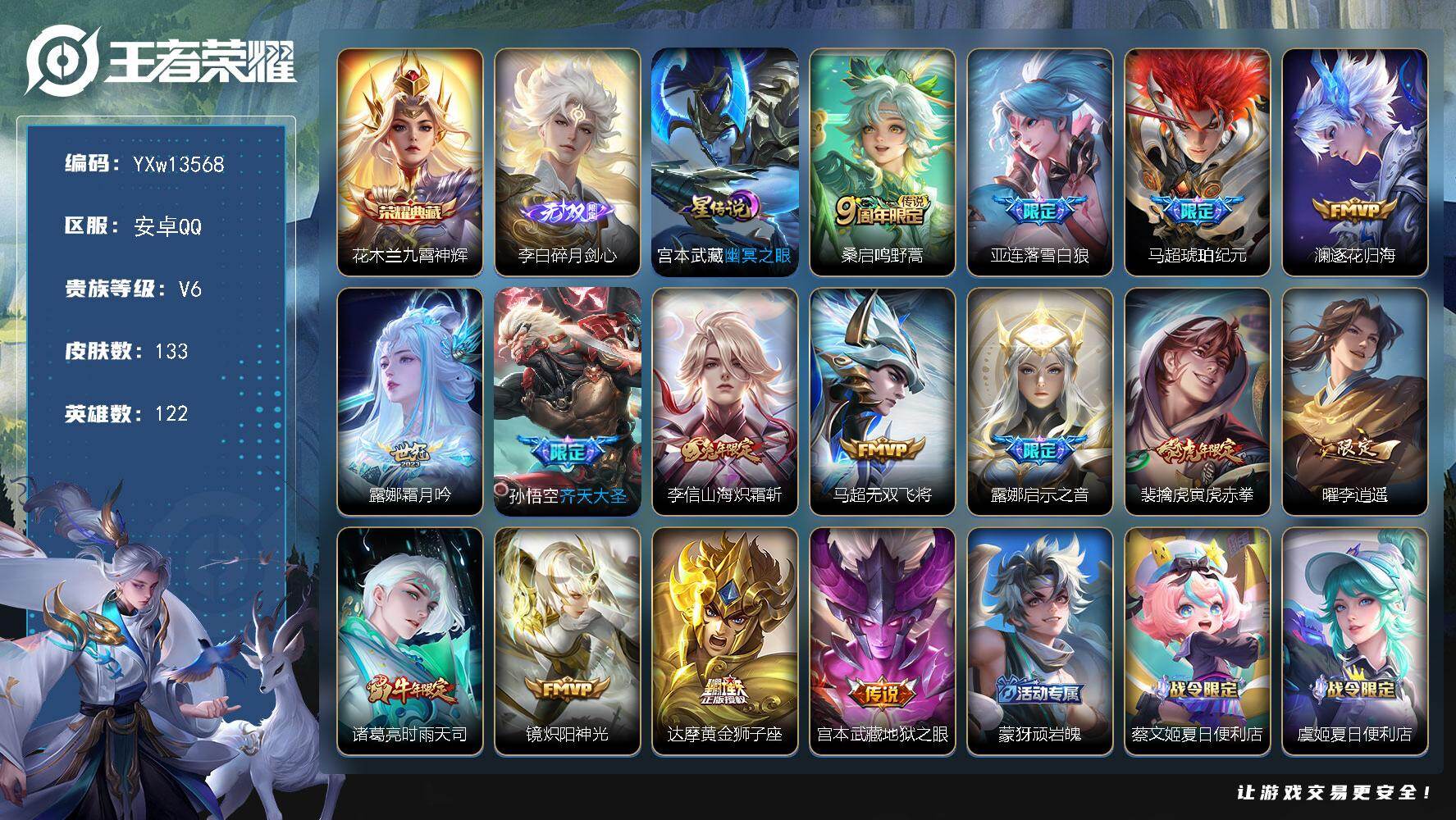 【精品推荐对抗号·1.2W金标亚连·1.1W金标马超·1.2W金标杨戬·万战金标白起·李逍遥·寅虎赤拳·马超琥珀纪元·落雪白狼·山海炽霜斩·无双飞将·可二次】YXw13568-安卓Q-122英雄-133皮肤-6王者印记-180铭文-贵族积分1w【贵族6】【1典藏·1无双·1星传说·15传说·3按键】【因赛季更新游戏段付以上号为准!】