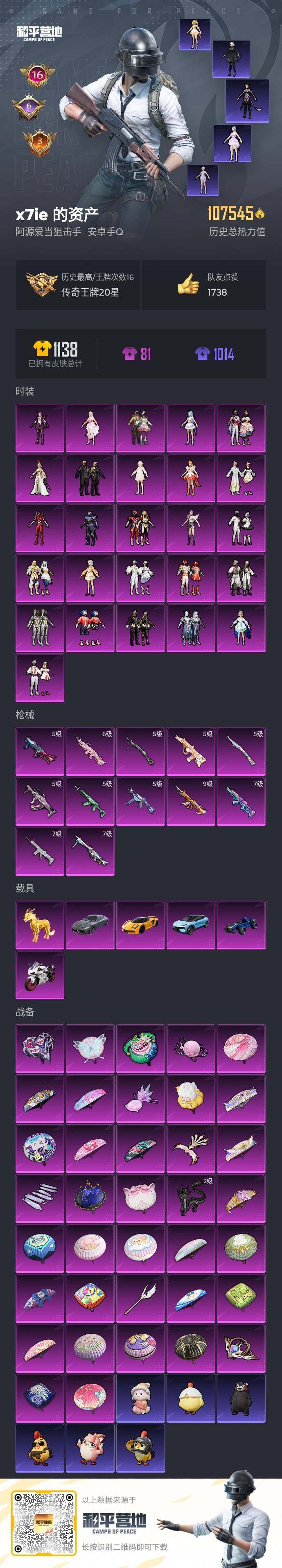 【店主推荐捡漏号!可直接换绑】安卓 手Q-26粉装-12特效枪-6载具-7粉色飞行器-107305热力值-16王牌印记-201套装-293枪皮