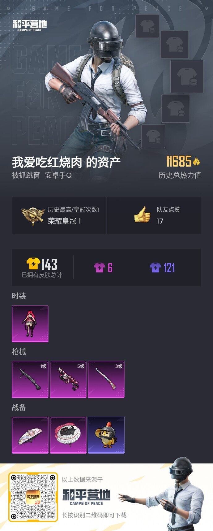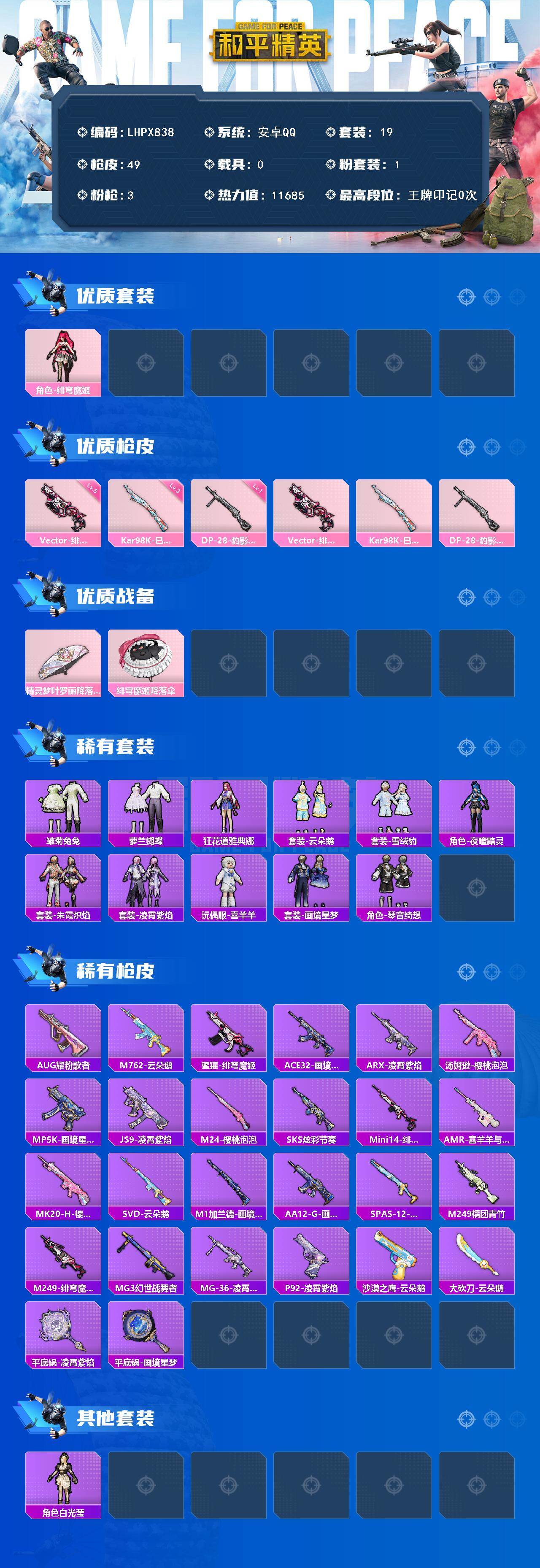 【店主推荐捡漏号!可直接换绑】安卓 手Q-1粉装-3特效枪-0载具-0粉色飞行器-11685热力值-1王牌印记-19套装-49枪皮【粉色套装】:角色-绯穹魔姬【粉色枪皮等级】:Vector-绯穹魔姬(五级),Kar98K-巳巳如意(三级),DP-28-豹影疾电(一级)【粉色枪皮】:Vector-绯穹魔姬,Kar98K-巳巳如意,DP-28-豹影疾电
