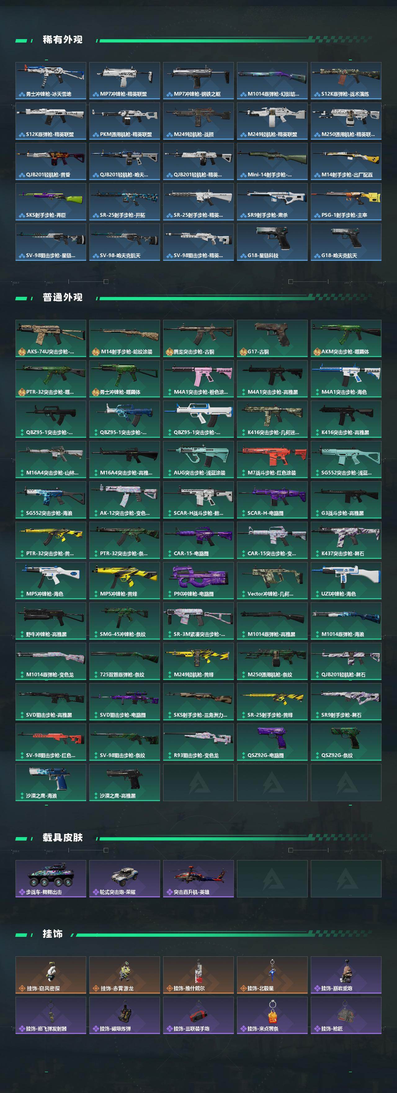 【传说外观】:M4A1突击步枪-阿米娅,ASh-12战斗步枪-鹅鸭杀,SG552突击步枪-运动员,AK-12突击步枪-创益工坊,SCAR-H战斗步枪-启航,G3战斗步枪-骑士,CAR-15突击步枪-阿米娅,腾龙突击步枪-