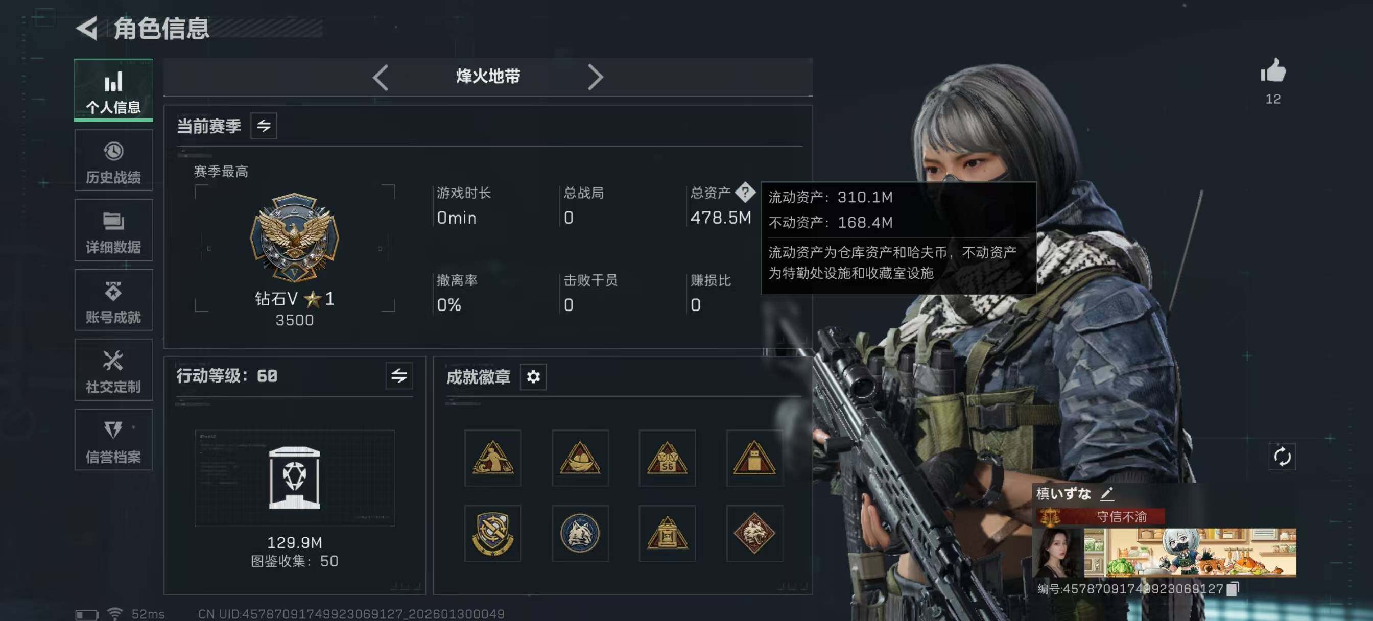 478m总资产-47955k哈伏币-60烽火等级-钻石-50战场等级-尉官【