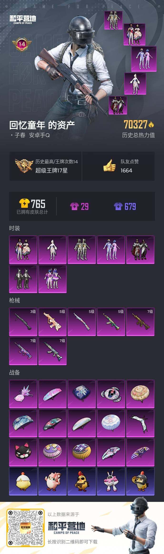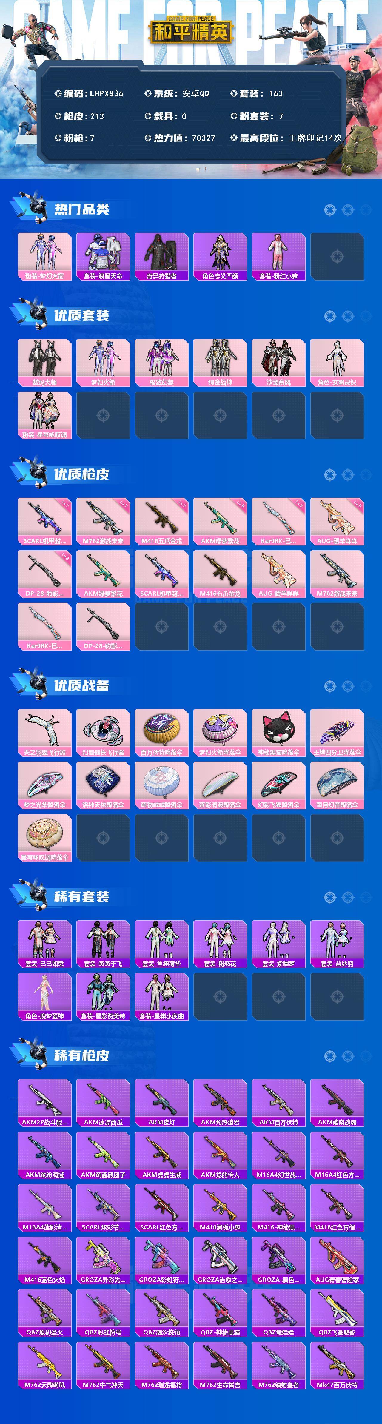 【店主推荐捡漏号!可直接换绑】安卓 手Q-7粉装-7特效枪-0载具-3粉色飞行器-70327热力值-14王牌印记-163套装-213枪皮【热门品类】:粉装-梦幻火箭,套装-浪漫天命,套装-奇异狩猎者,角色-忠义严颜,套装-粉红小猪【粉色套装】:粉装-数码大师,粉装-梦幻火箭,粉装-极致幻想,粉装-绚金战神,粉装-沙场疾风,角色-女娲灵识,粉装-星穹咏叹调【粉色枪皮等级】:AKM-绿萝繁花(五级)