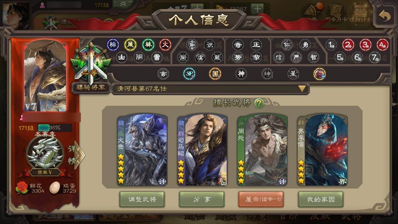 【1286】官阶:骠骑将军;VIP等级:VIP7;史诗武将数量:23;动态皮肤