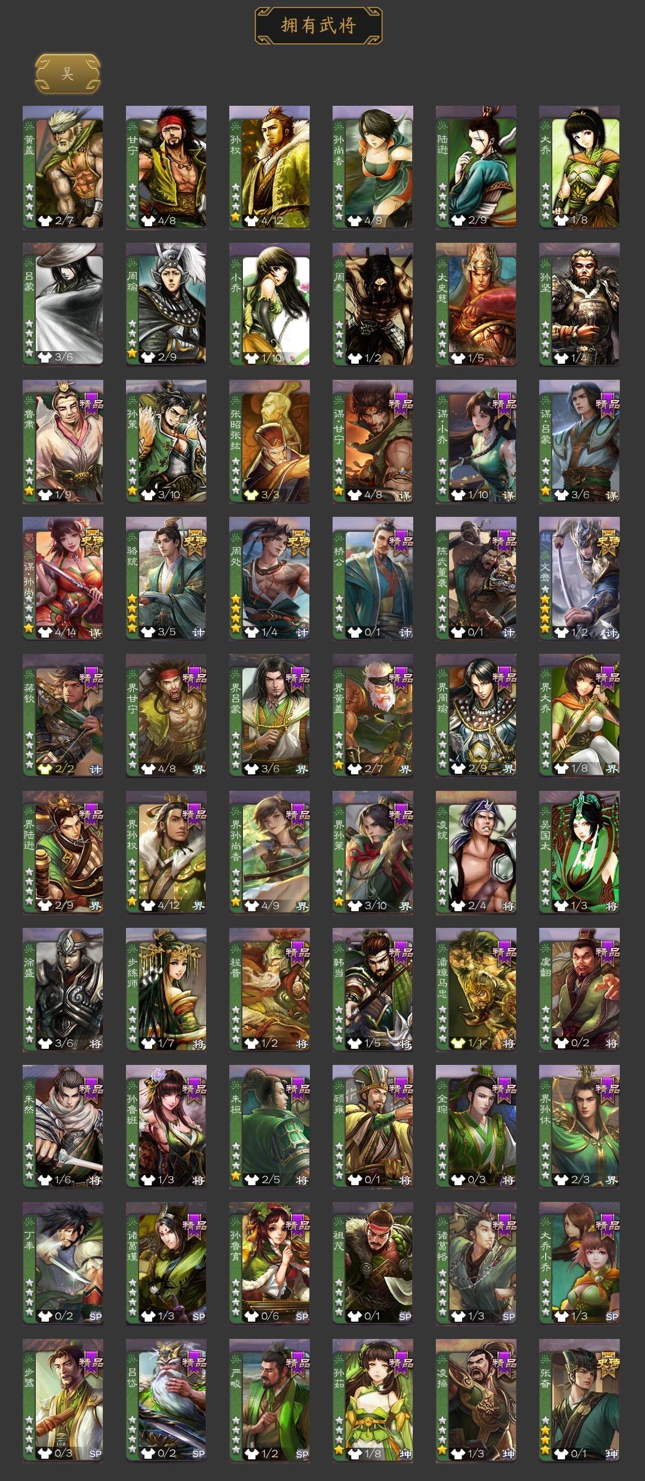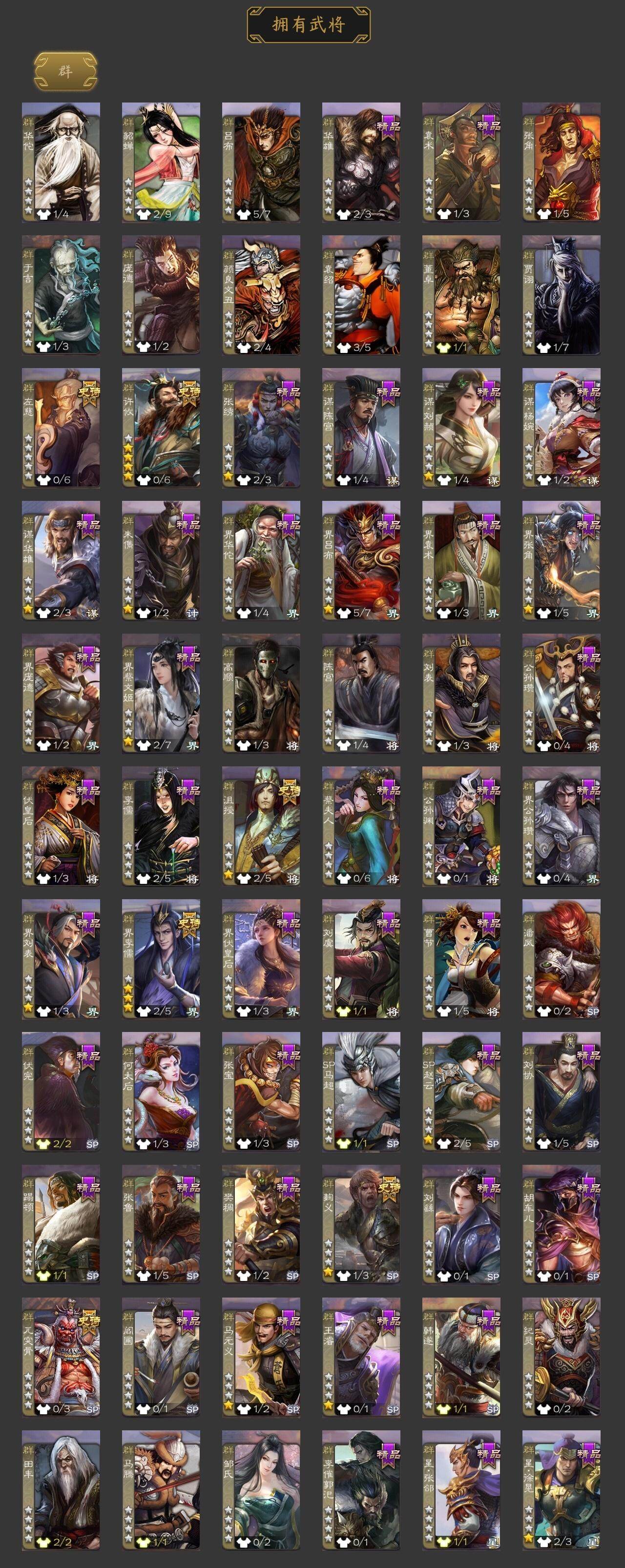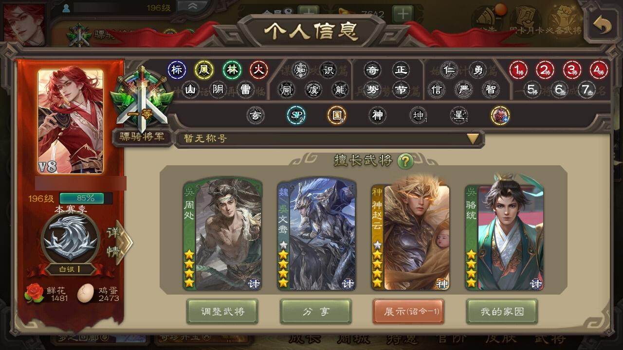 【1287】官阶:骠骑将军;VIP等级:VIP8;史诗武将数量:21;动态皮肤数量:22;武将总数:269;史诗宝珠数量:13;将魂数量:2925;神将:3;魏国史诗武将:14;蜀国史诗武将:4;吴国史诗武将:7;群史诗武将:6