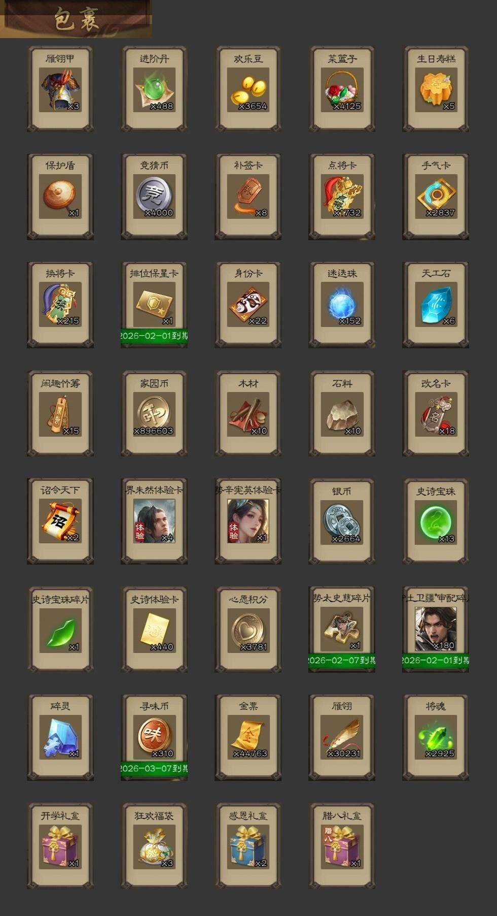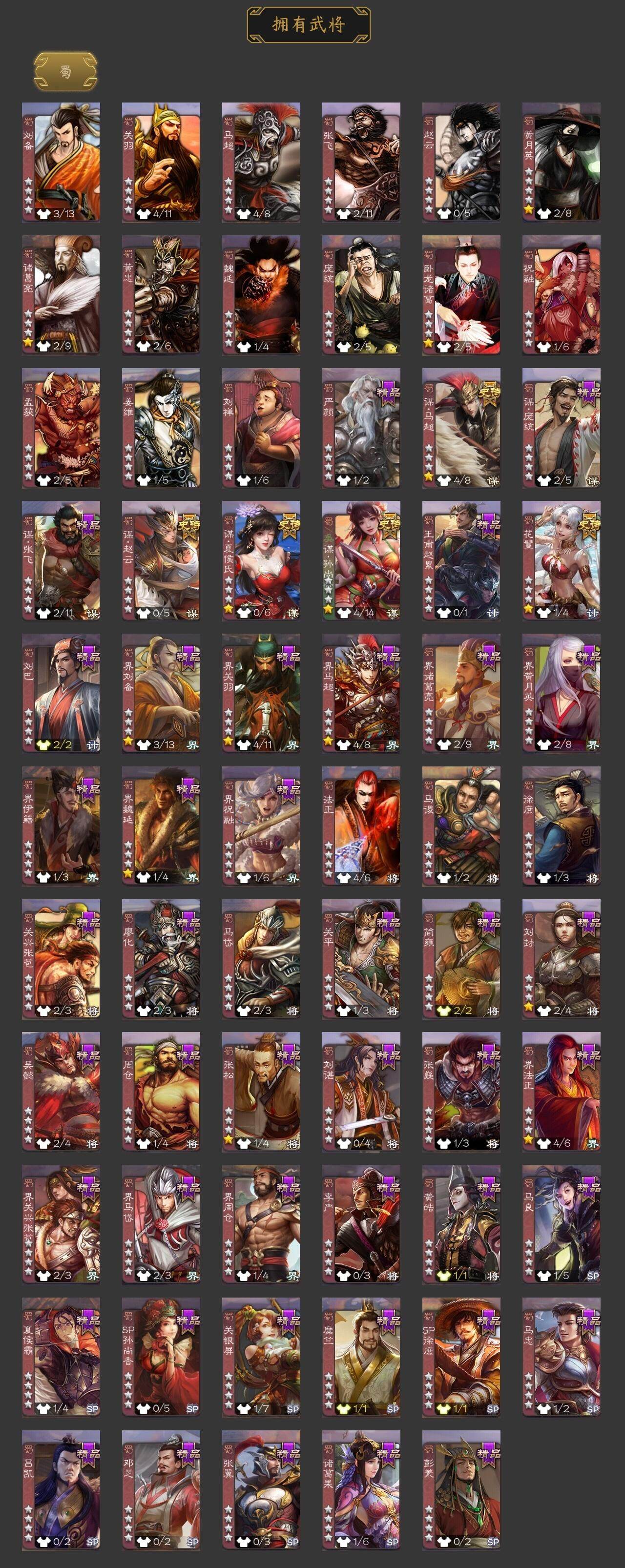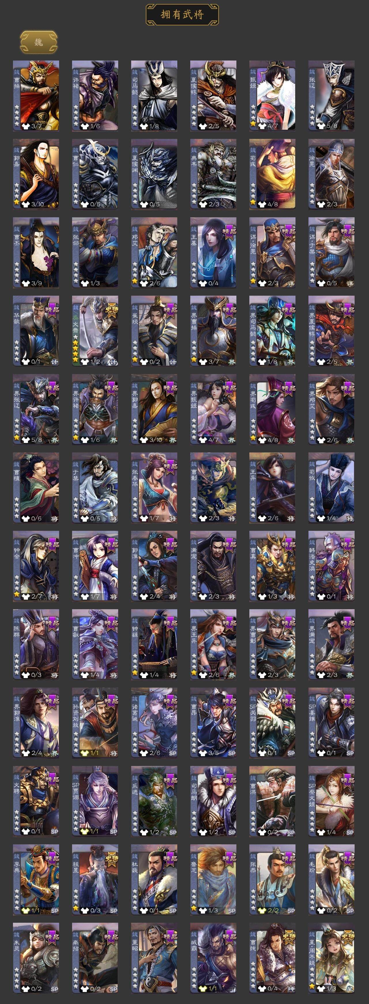 【1287】官阶:骠骑将军;VIP等级:VIP8;史诗武将数量:21;动态皮肤数量:22;武将总数:269;史诗宝珠数量:13;将魂数量:2925;神将:3;魏国史诗武将:14;蜀国史诗武将:4;吴国史诗武将:7;群史诗武将:6