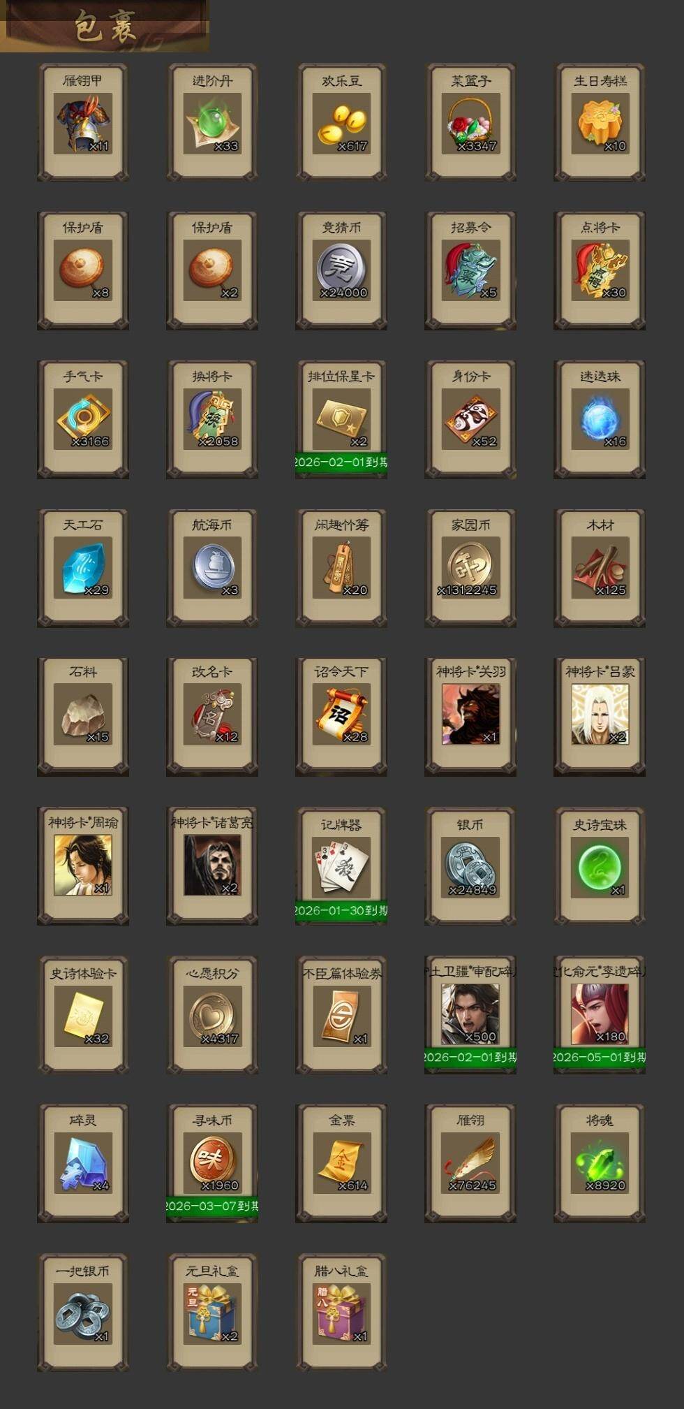【1288】官阶:大将军;VIP等级:VIP9;史诗武将数量:46;动态皮肤数量:48;武将总数:396;史诗宝珠数量:1;将魂数量:8920;神将:3;魏国史诗武将:35;蜀国史诗武将:9;吴国史诗武将:8;群史诗武将:12