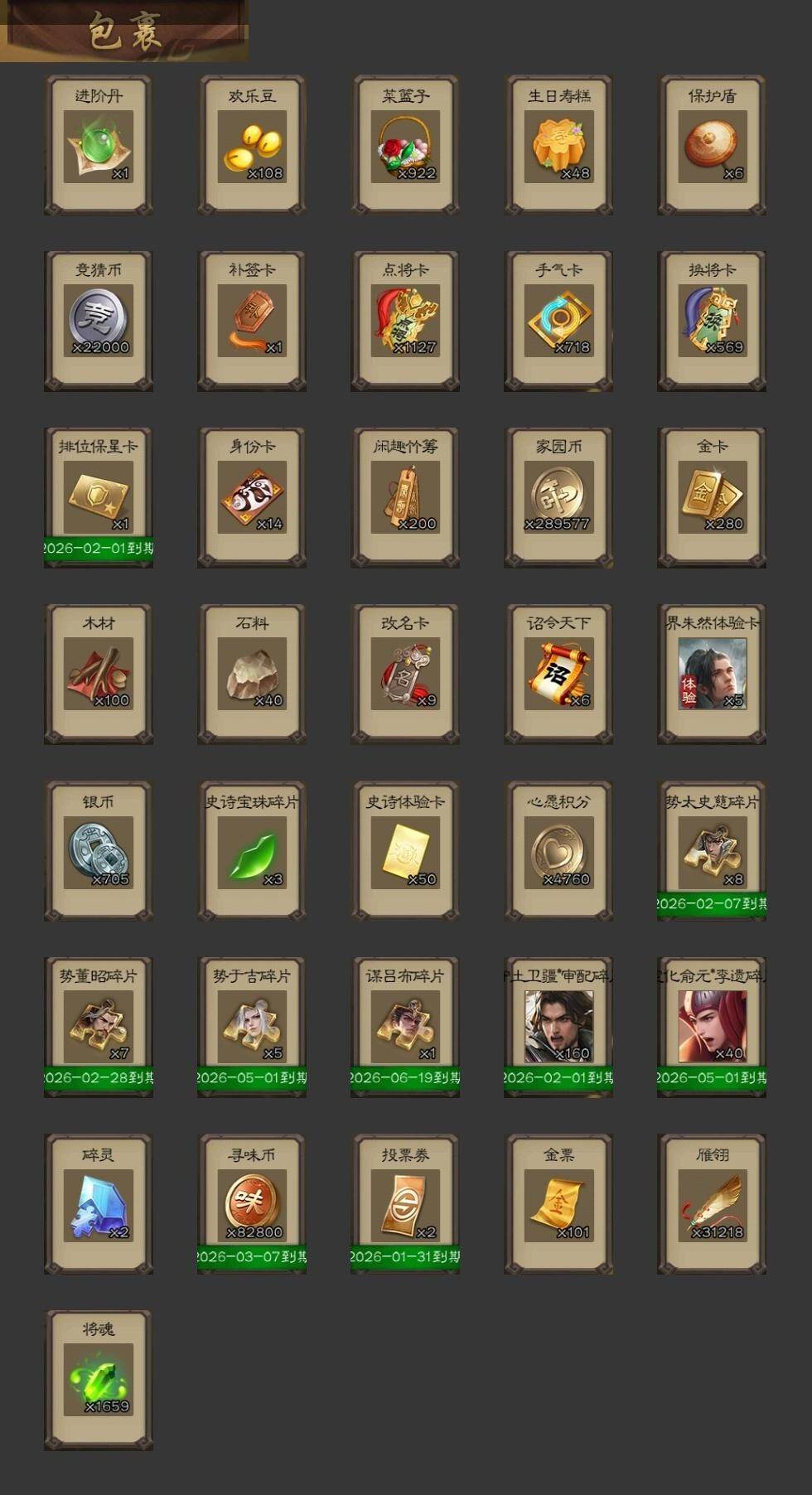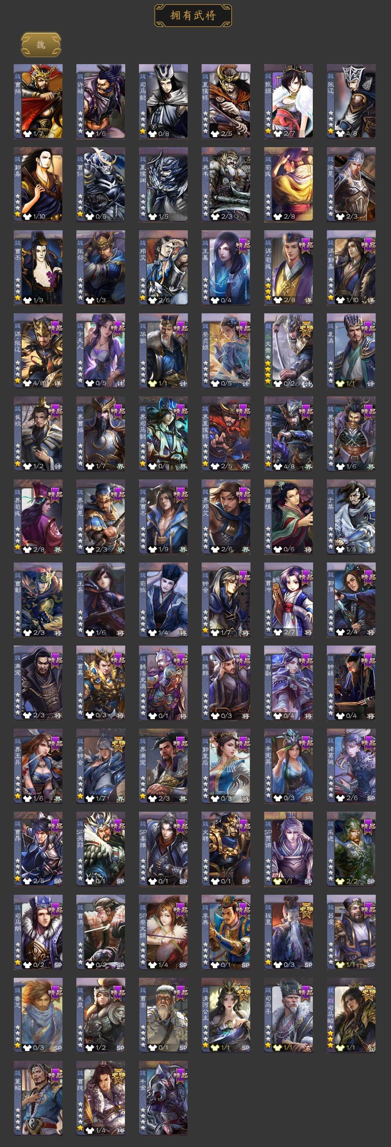 【1290】官阶:骠骑将军;VIP等级:VIP9;史诗武将数量:22;动态皮肤数量:12;武将总数:285;史诗宝珠数量:0;将魂数量:1659;神将:2;魏国史诗武将:8;蜀国史诗武将:5;吴国史诗武将:5;群史诗武将:9