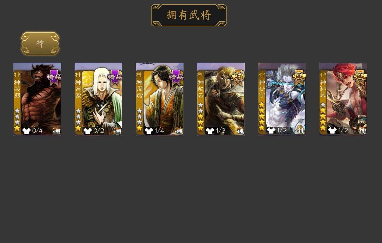 神赵云,神甘宁,神孙策,曹髦,星周不疑,杨修,王元姬,王朗,马钧,界钟会,界于禁,曹纯,戏志才,谋曹丕,程昱,关索,谋黄忠,谋夏侯氏,谋赵云,谋马超,诸葛瞻,周群,张星彩