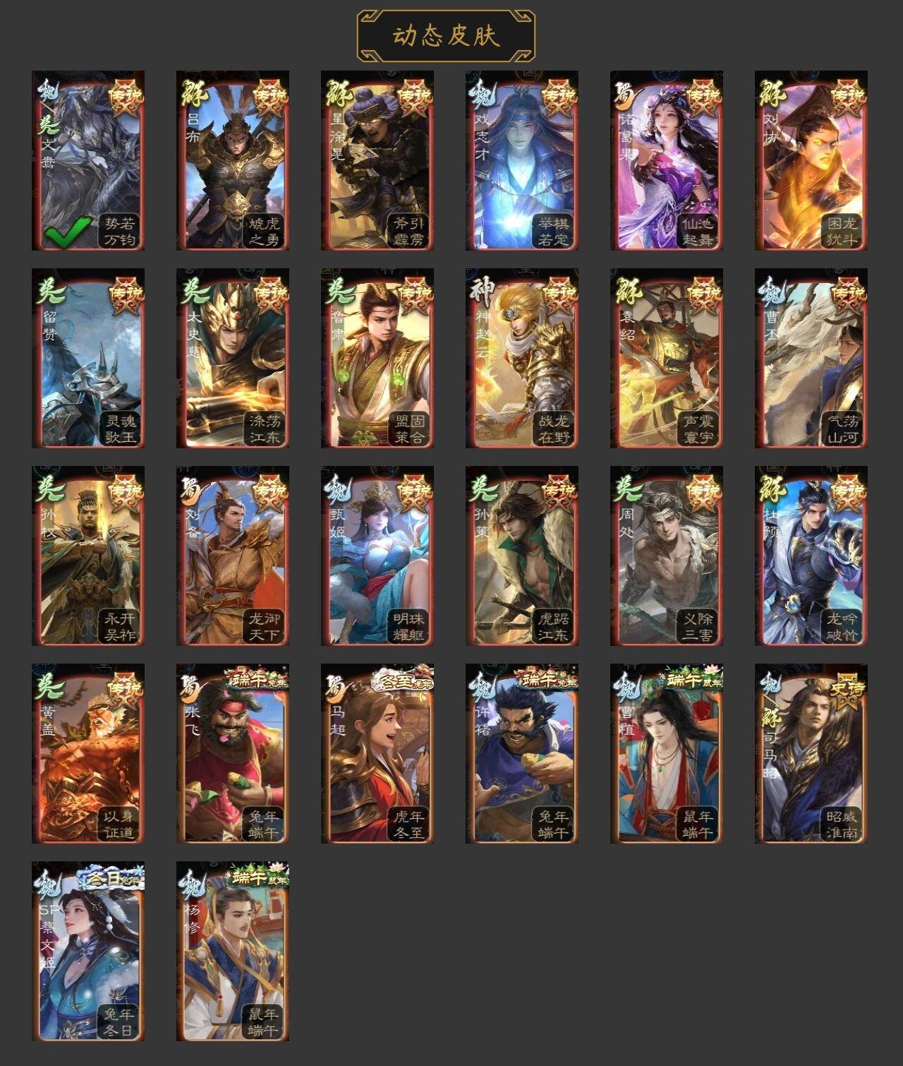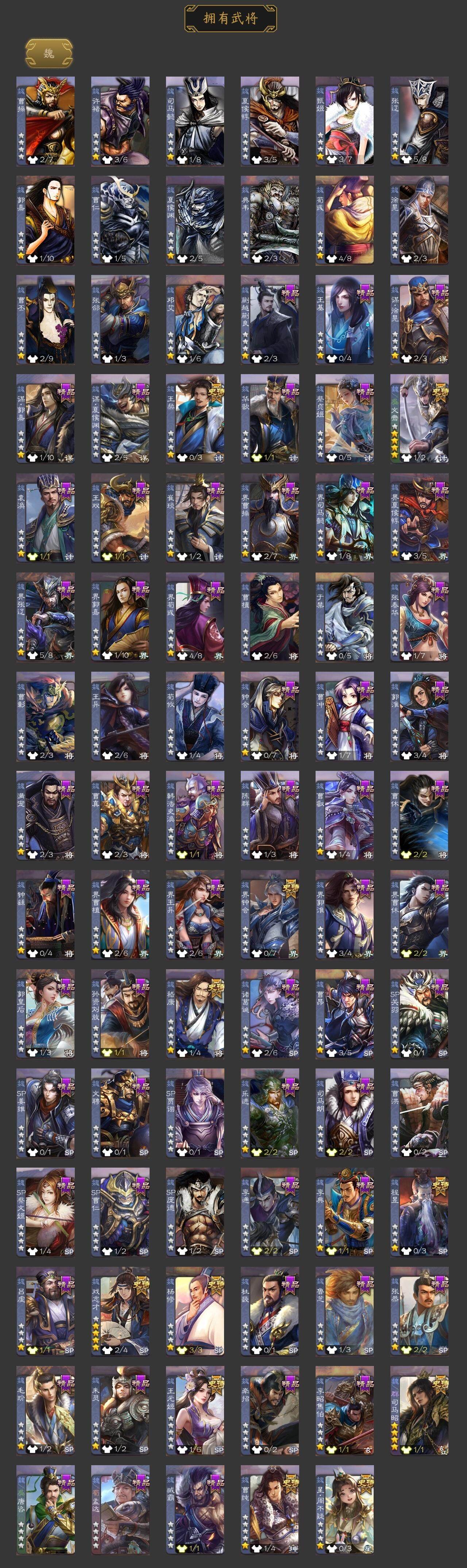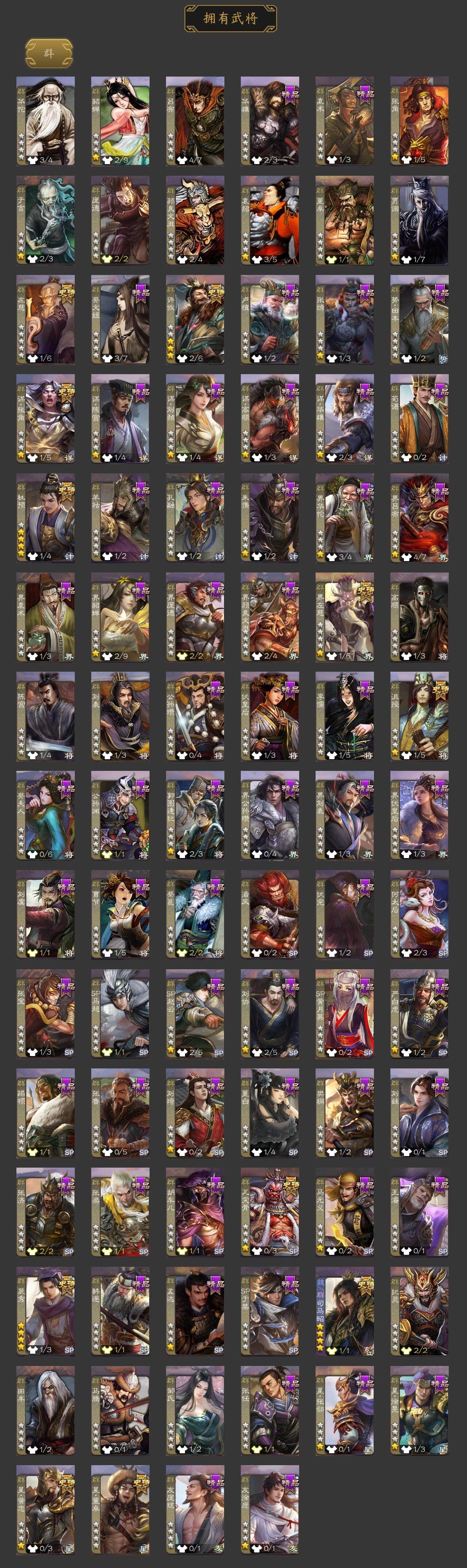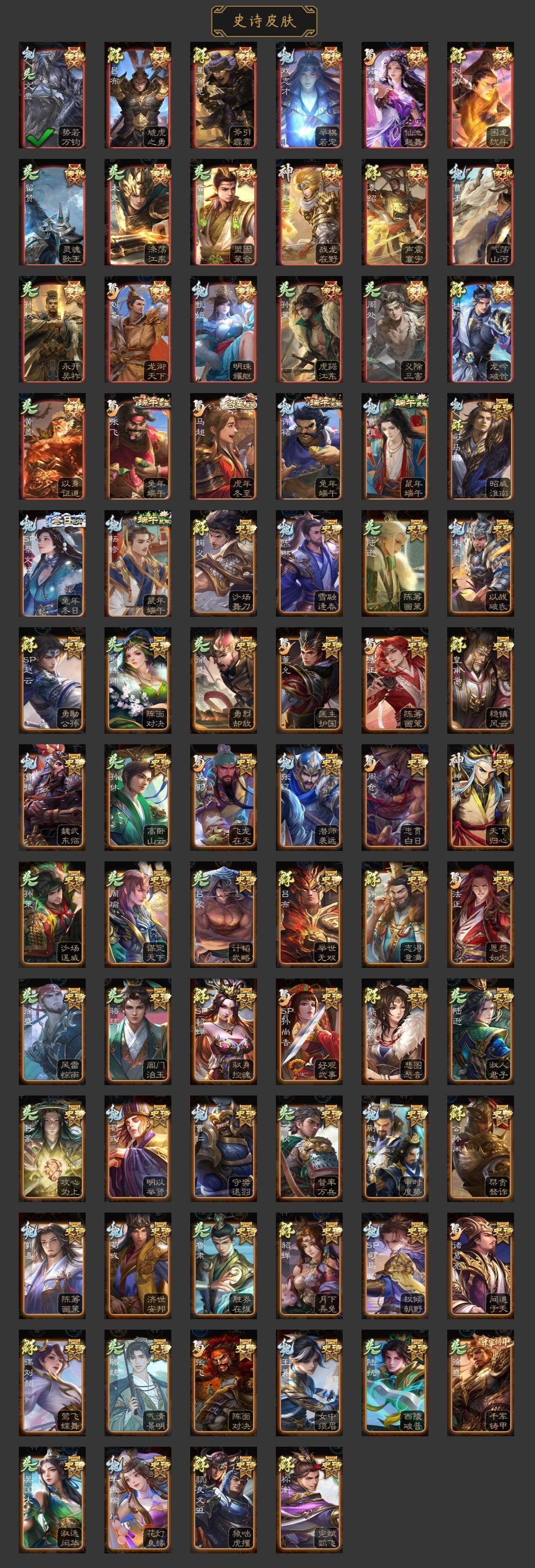 神吕布,神赵云,神刘备,神太史慈,神诸葛亮,星周不疑,王粲,杨修,王元姬,界钟会,嵇康,曹纯,戏志才,程昱,谋赵云,谋马超,赵襄,界黄忠,花鬘,董允,谋黄盖,骆统,留赞,