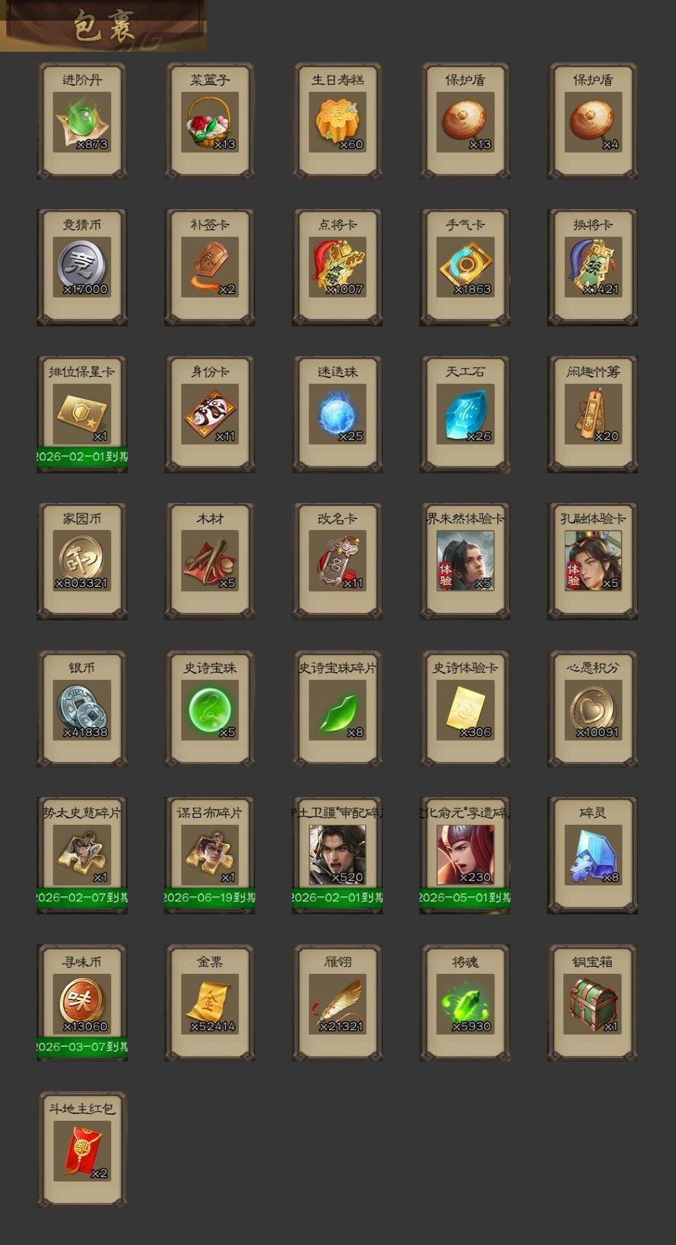 【1292】官阶:大将军;VIP等级:VIP9;史诗武将数量:36;动态皮肤数量:24;武将总数:340;史诗宝珠数量:5;将魂数量:5930;神将:5;魏国史诗武将:14;蜀国史诗武将:6;吴国史诗武将:7;群史诗武将:12