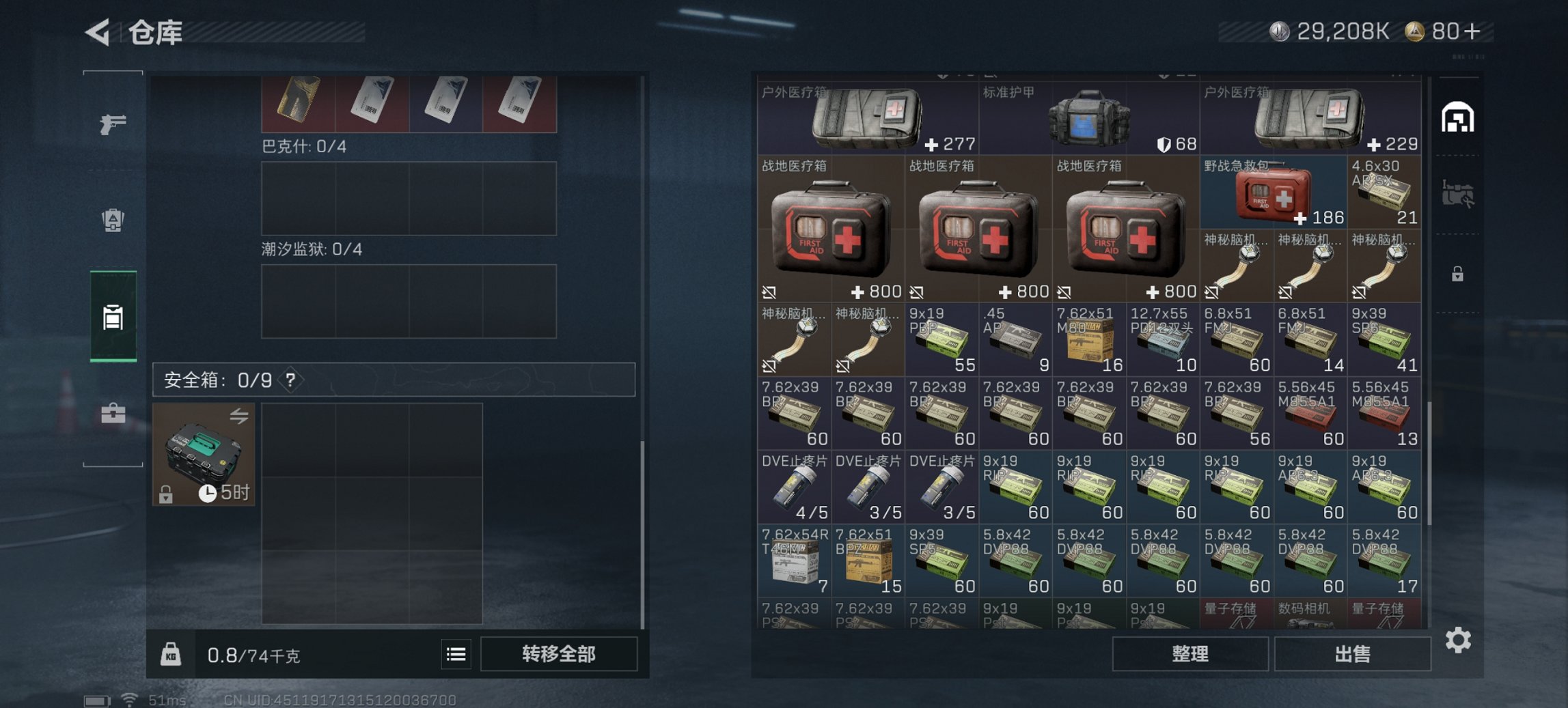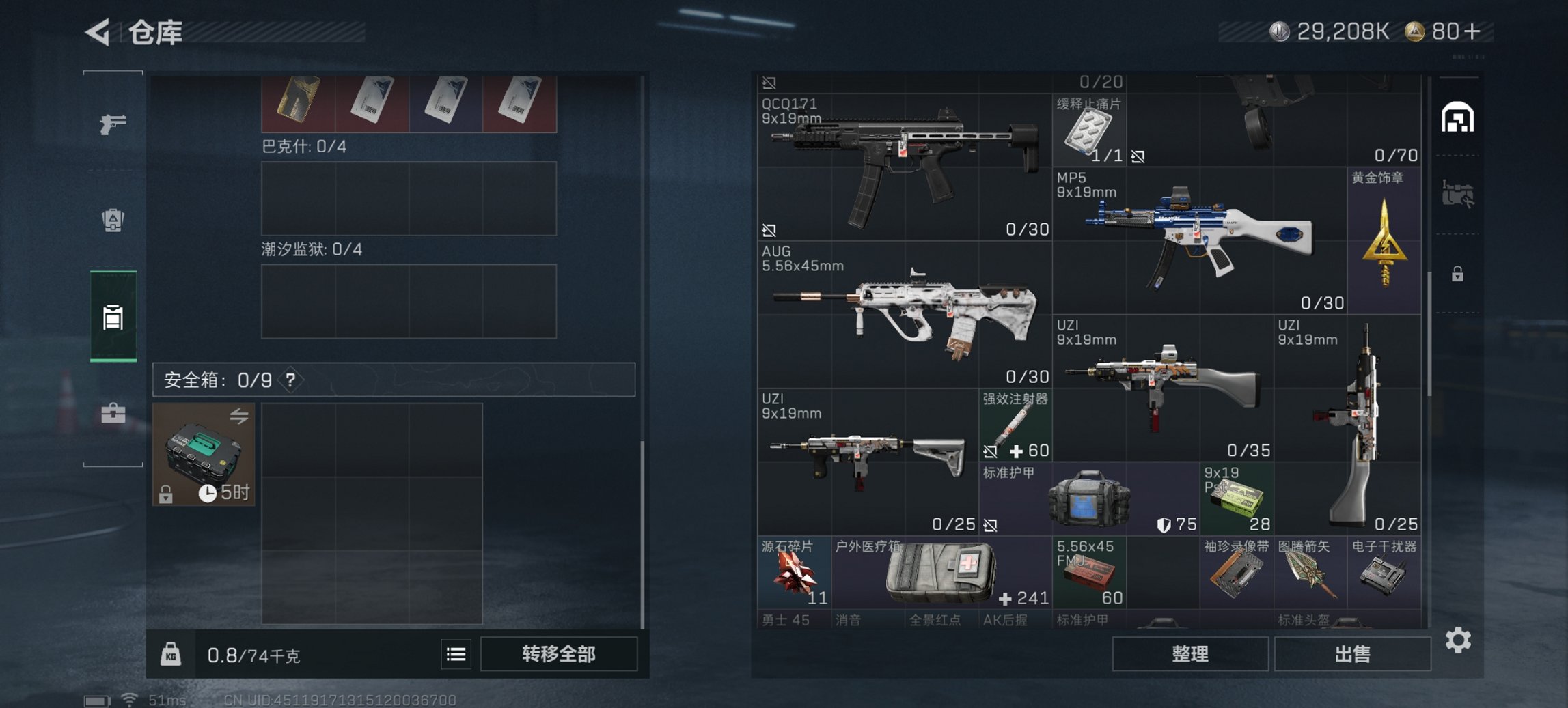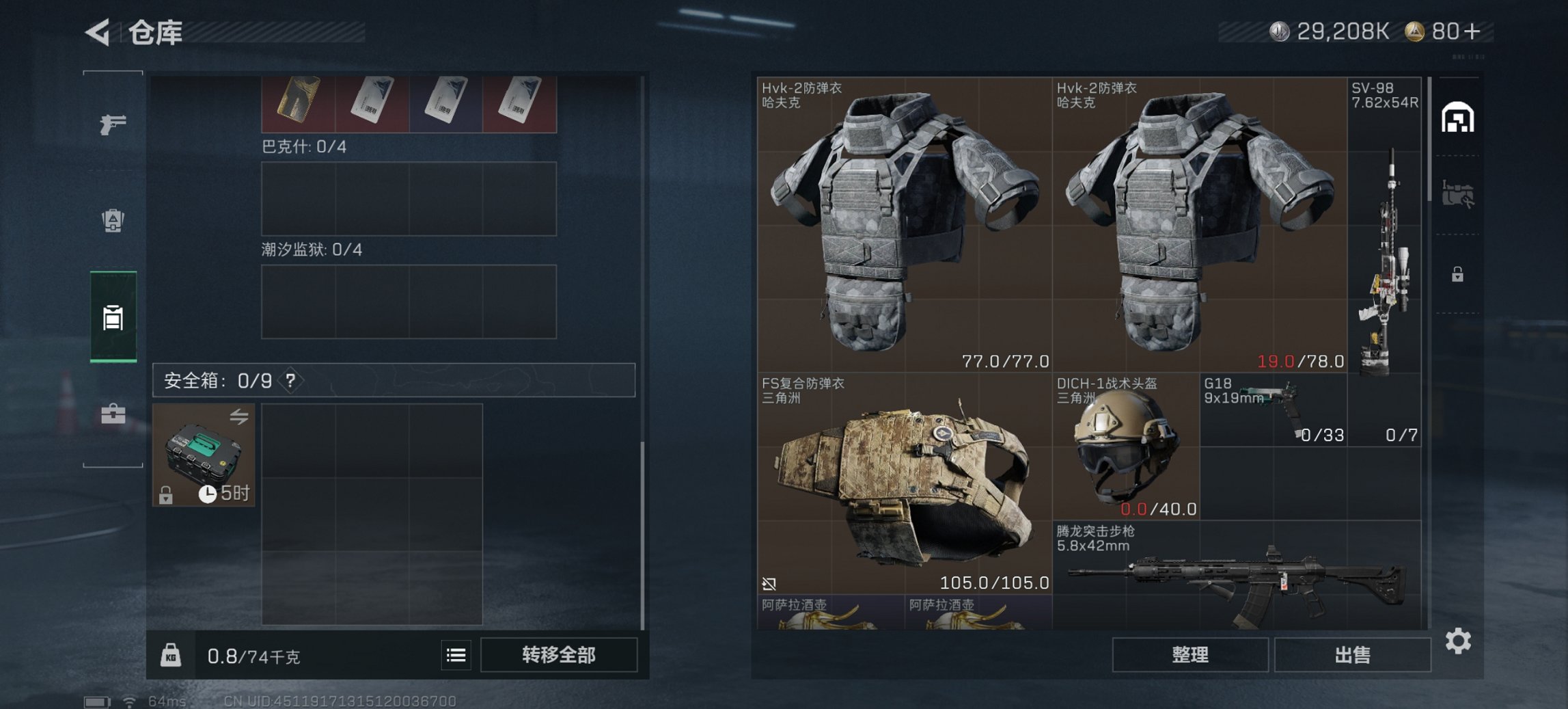 总资产45M,哈夫币29,208K,行动等级:27,仓库等级:63279