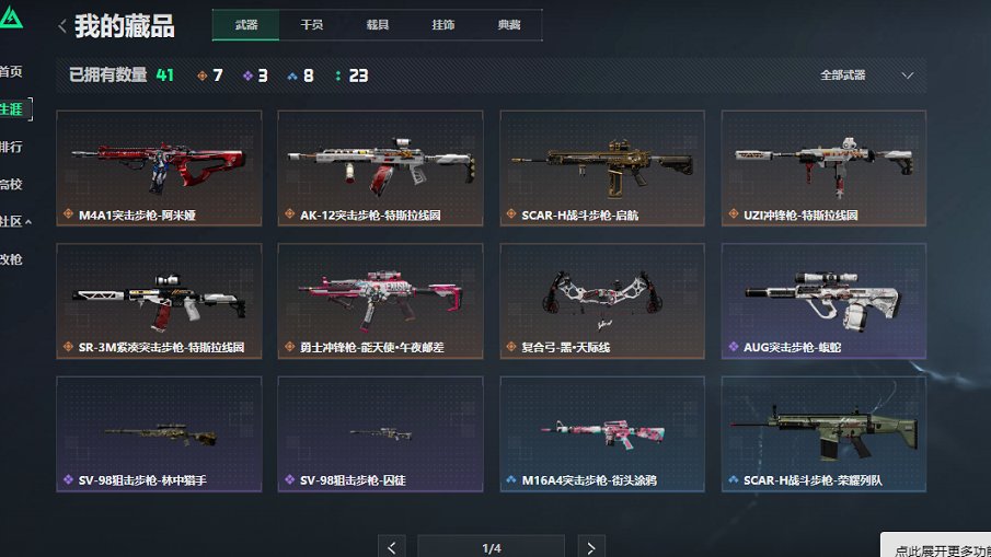 【枪皮】 M4A1突击步枪-高雅黑 G3战斗步枪-高雅黑 M4A1突击步枪-海色 M16A4突击步枪-街头涂鸦 AUG突击步枪-蝮蛇 SCAR-H战斗步枪-荣耀列队 M16A4突击步枪-山林猎人 PTR-32突击步枪-黄蜂 AK-12突击步枪-特斯拉线圈 M4A1突击步枪