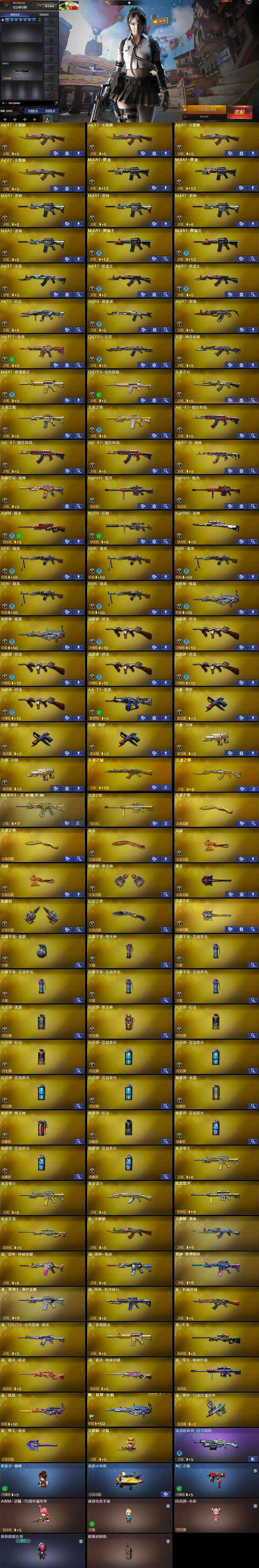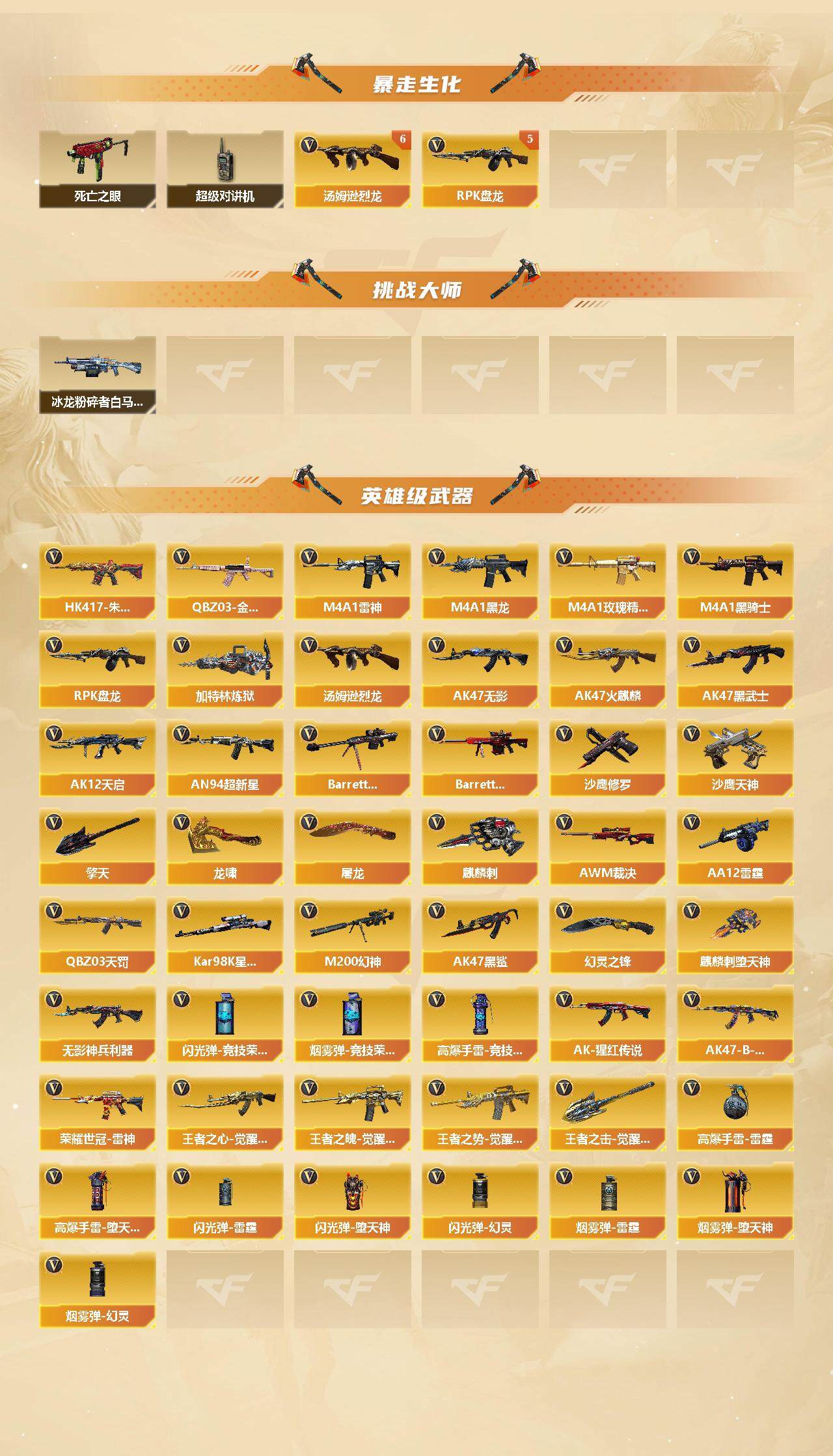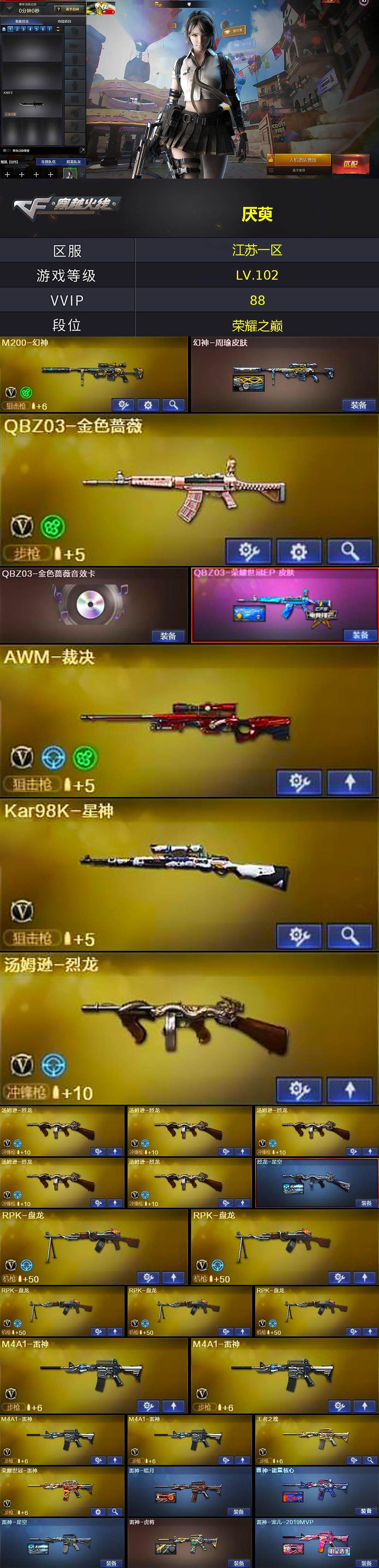 【热门武器】:QBZ03-金色蔷薇,HK417-朱雀,M200-幻神,死亡之眼,荣耀世冠-雷神,Kar98K-星神,M4A1-黑骑士*2,汤姆逊-烈龙*6,RPK-盘龙*5,加特林-炼狱*2,斯泰尔-蝴蝶,降世魔童,沙鹰-修罗*3