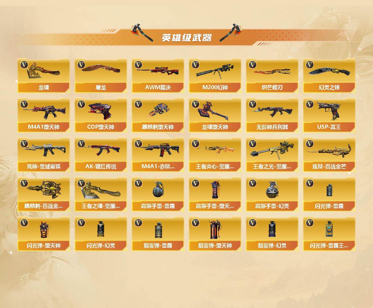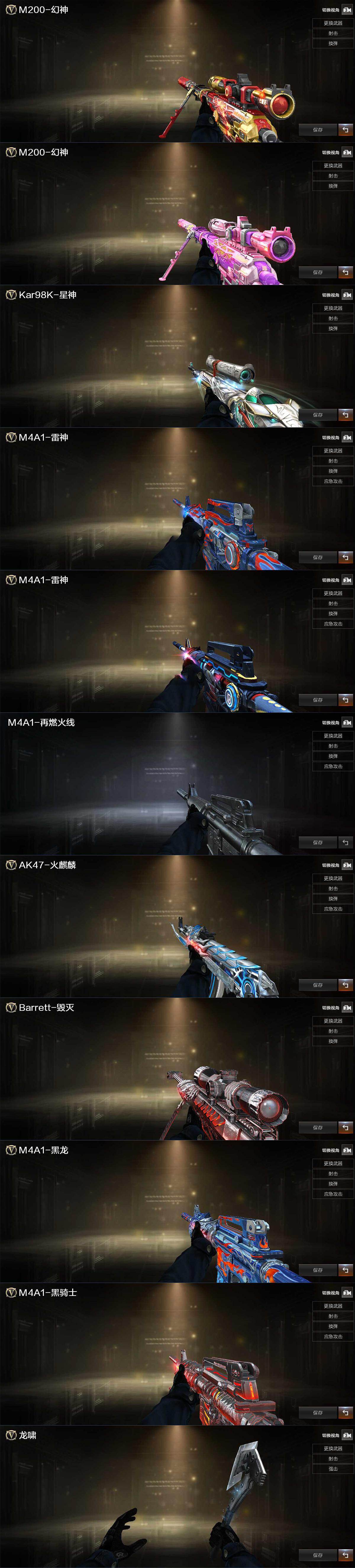 【热门武器】:传说光耀,QBZ03-金色蔷薇,M200-幻神,死亡之眼,C.A.T,毒蜂,M4A1-黑骑士,COP-堕天神,沙鹰-修罗*3,炽芒蝶刃