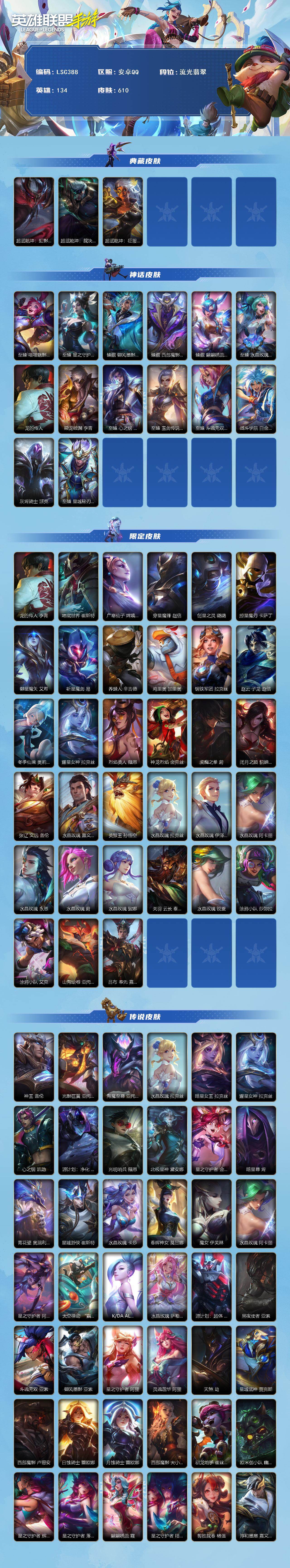 【LSC388】134英雄/610皮肤/3典藏/14神话/76传说/364史诗/流光翡翠/超武乾坤劫/超武乾坤德莱厄斯/超武乾坤莎弥拉/至臻 喵喵魅影 金克丝/至臻 星之守护者 辛德拉/臻藏 御风墨影 亚索/臻藏 西部魔影 卢锡安/臻藏 翩翩绣蕊 霞/至臻 水晶玫瑰 格温/龙的传人 李青/乘龙破渊 李青/至臻 心之钢 永恩/至臻 玉剑传说 武剑仙 锐雯/至臻 斗魂无双 艾瑞莉娅/战斗学院 白金学长 伊泽瑞尔/灰烬骑士 派克/至臻 星域秘刃 泰隆/地底世界 崔斯特/广寒仙子 嫦娥 黛安娜/穿星魔锋