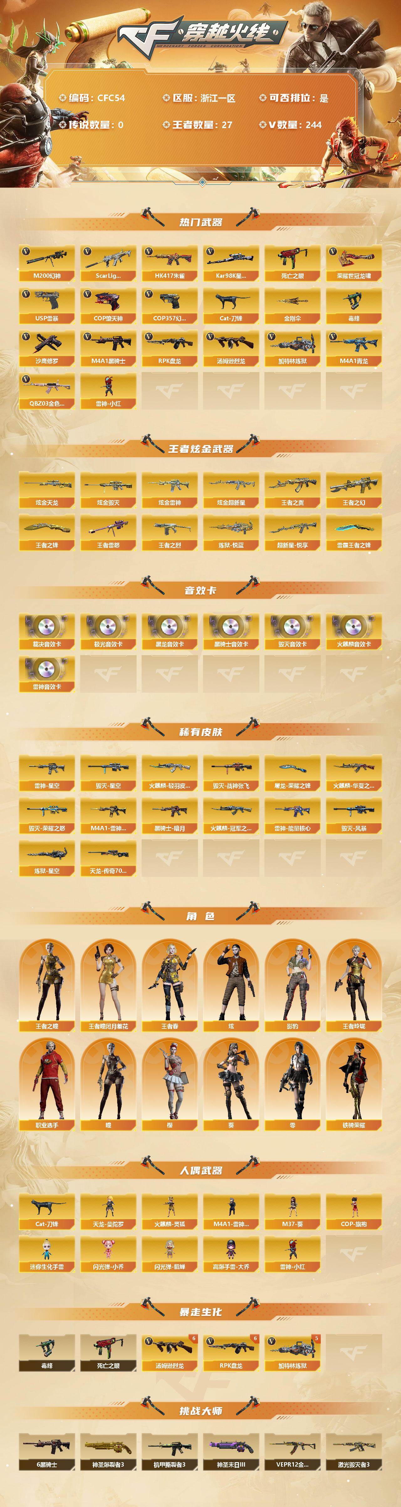 【CFC54】238V/102级/荣耀元首/27王者/8炫金/6英雄/QBZ03-金色蔷薇/scar_白虎/HK417_朱雀/M4A1_青龙/M200_幻神/死亡之眼/98K_星神/Cat-刀锋/毒蜂/M4A1_黑骑士/汤姆逊烈龙/RPK_盘龙/加特林_炼狱/雷神-小红/USP_雷暴/COP_堕天神/COP 357-幻灵/沙鹰_修罗/荣耀世冠-龙啸/金刚伞/炫金天龙/炫金毁灭/炫金雷神/炫金超新星/炼狱-悦蓝/超新星-悦享/王者之幻/王者之翼/王者雷怒/王者之烈/王者之锋/雷霆王者之锋/AK47