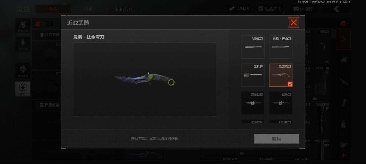 等级:30/段位:王牌/仓库价值(百万):2.4/柯恩币:42146/急袭弯刀/伦琴幻影FAL/银月AN94