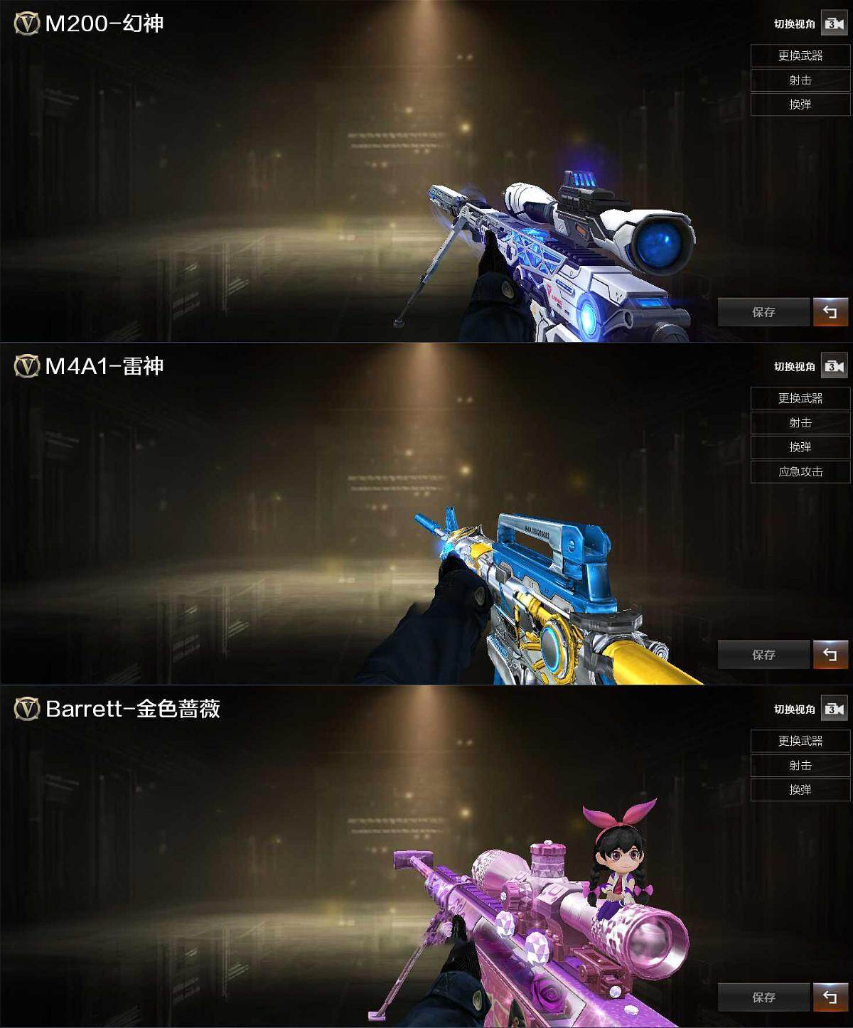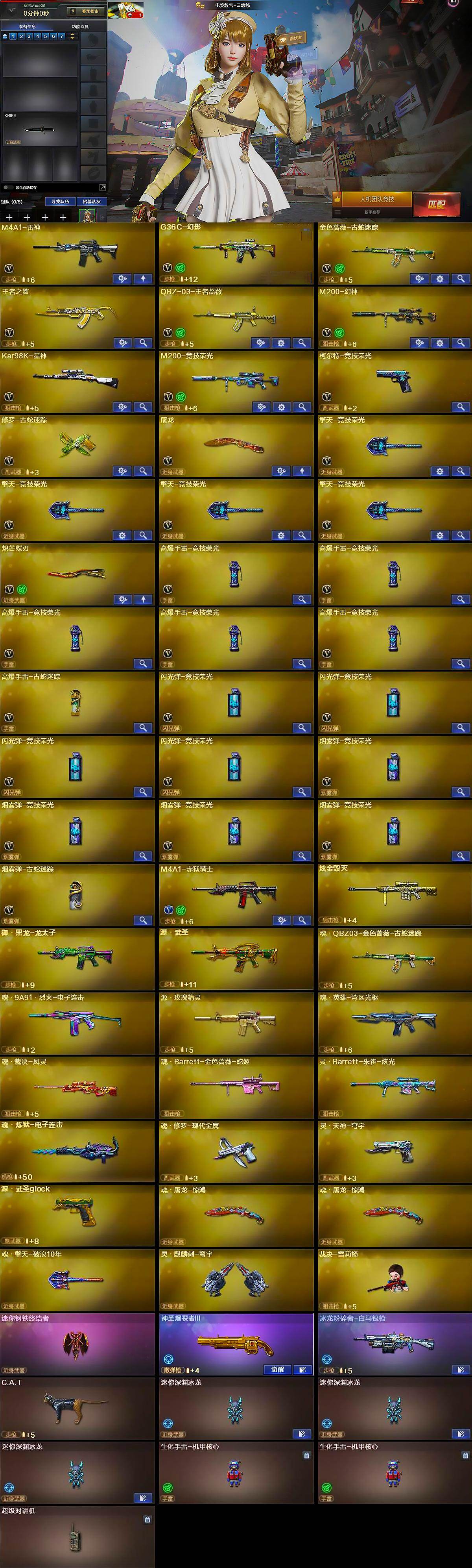 【热门武器】:G36C-幻影,M200-幻神,金色蔷薇-古蛇迷踪,修罗-古蛇迷踪,M200-竞技荣光,Kar98K-星神,C.A.T,裁决-雪莉杨,炽芒蝶刃