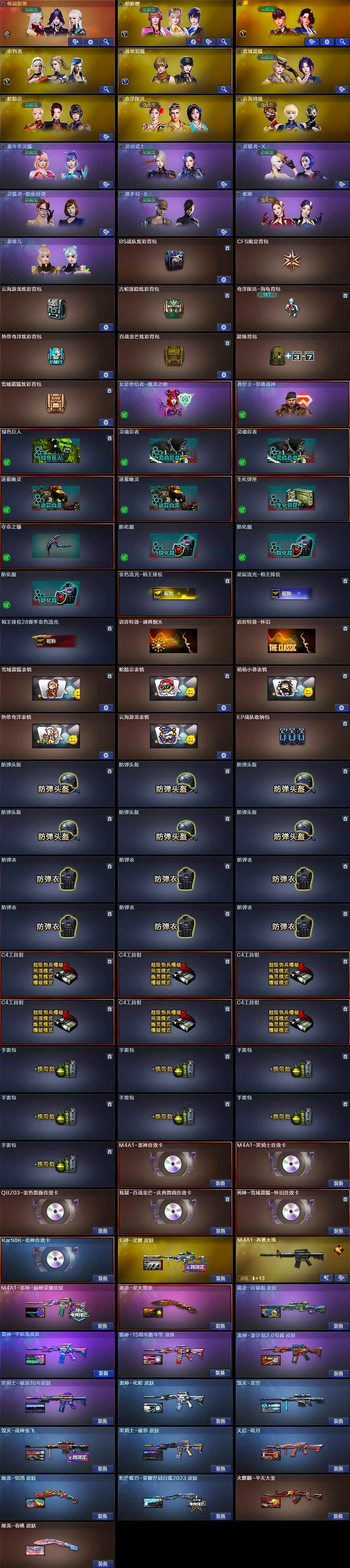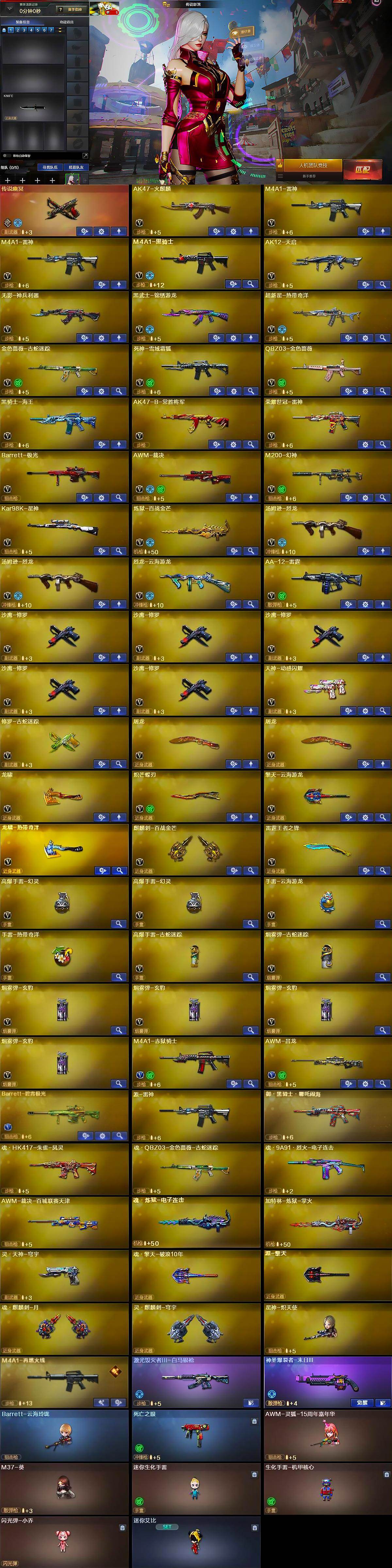 【热门武器】:传说幽冥,QBZ03-金色蔷薇,M200-幻神,金色蔷薇-古蛇迷踪,修罗-古蛇迷踪,死亡之眼,荣耀世冠-雷神,Kar98K-星神,M4A1-黑骑士,汤姆逊-烈龙*2,羊驼玩偶*2,沙鹰-修罗*5,炽芒蝶刃,炽芒蝶刃-荣耀世冠白鲨2023 皮肤