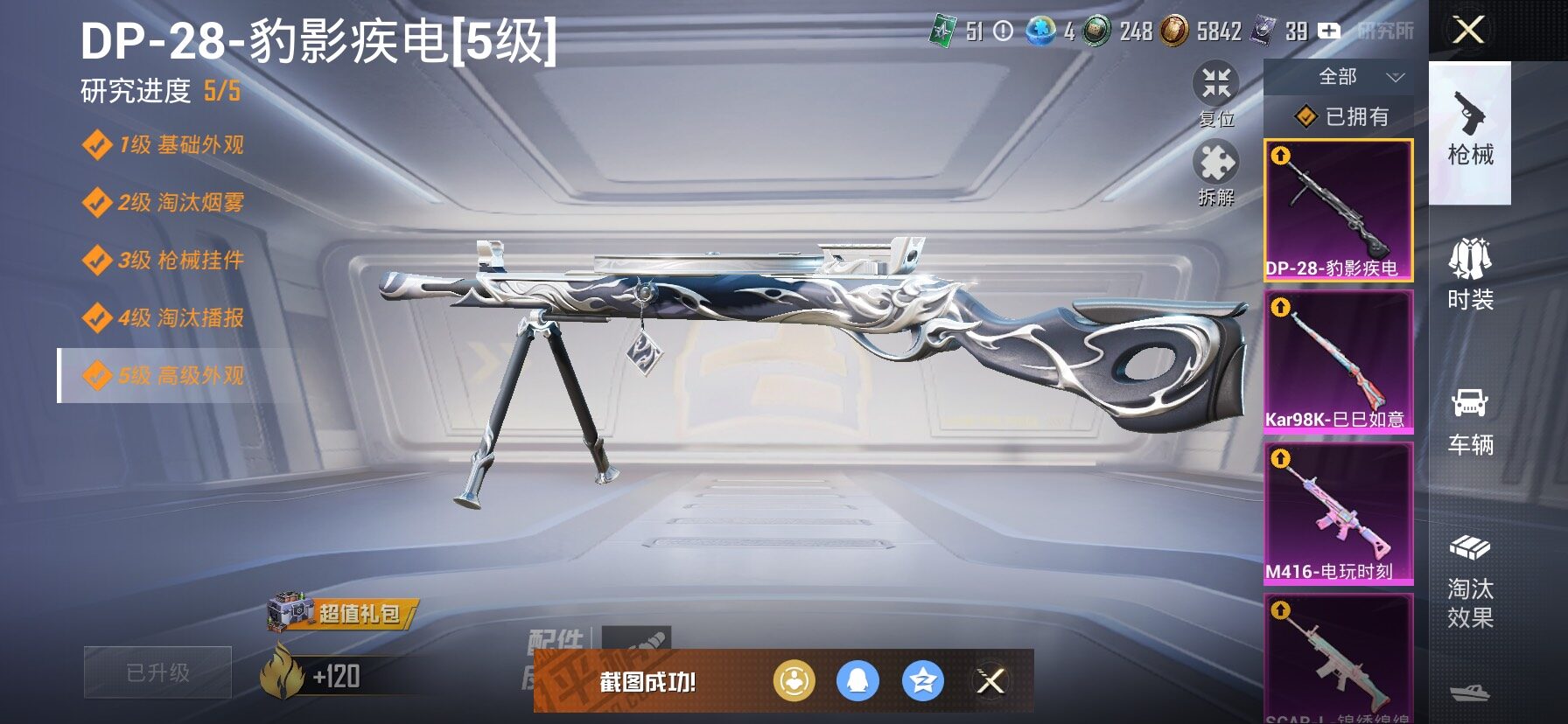【5特效枪】 SCAR-L-锦绣绵绵 (5级) M416-电玩时刻 (5级) AKM-绿萝繁花 (5级) Kar98K-巳巳如意 (5级) DP-28-豹影疾电 (5级)