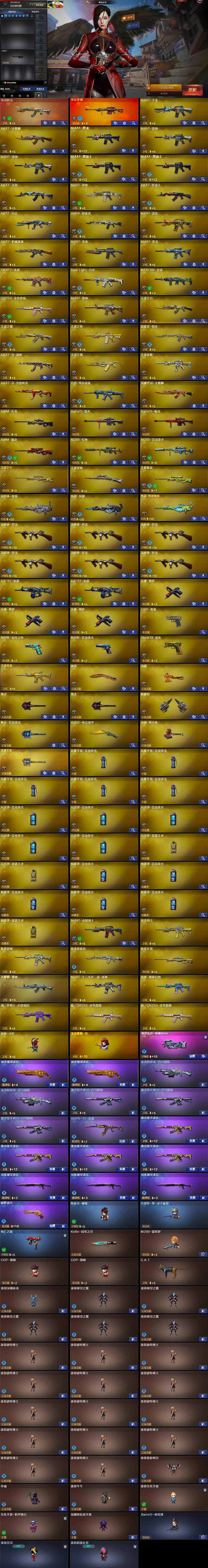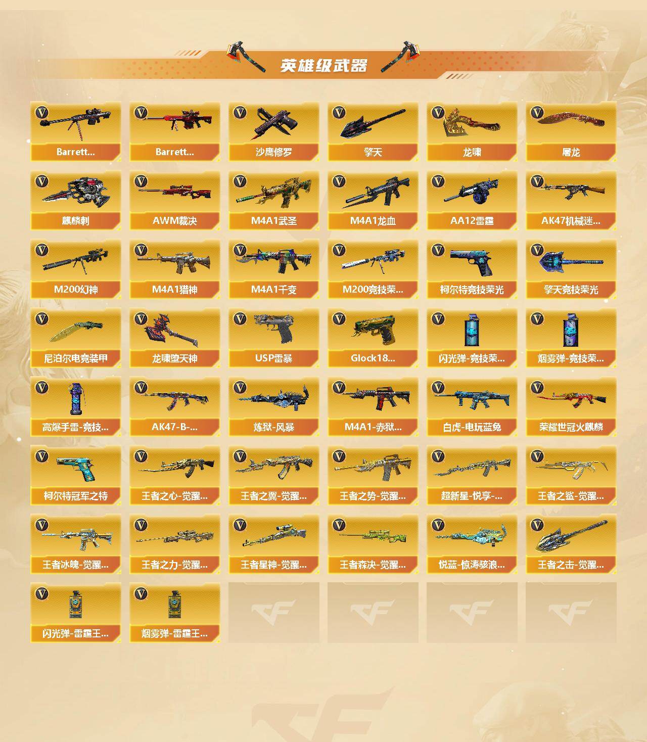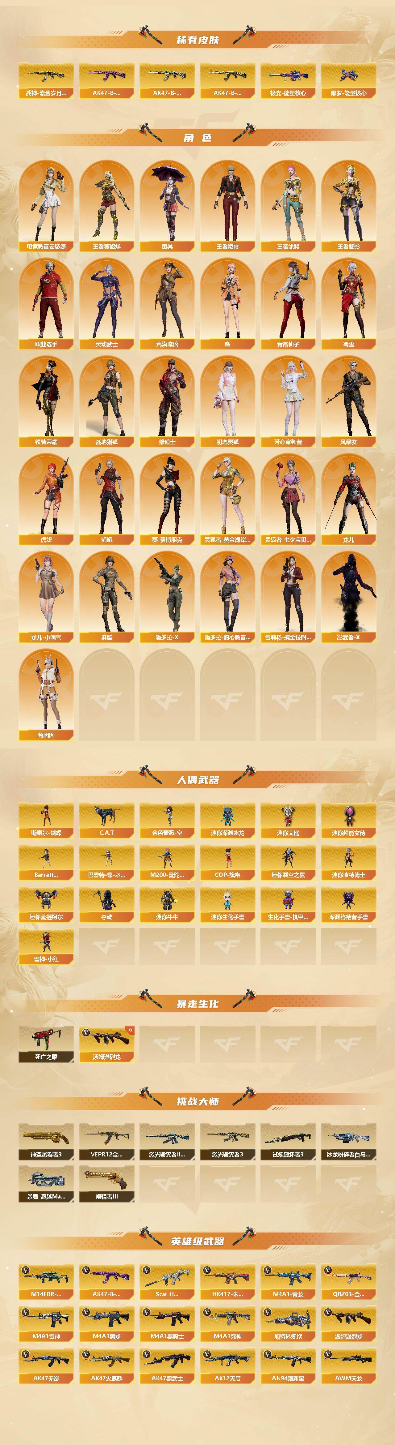 【热门武器】:传说梦魇,传说辉光,QBZ03-金色蔷薇,M14EBR-玄武,Scar Light-白虎,HK417-朱雀,M4A1-青龙,M200-幻神,M200-竞技荣光,死亡之眼,荣耀世冠-火麒麟,白虎-电玩蓝兔,柯尔特-冠军之特,金色小号,C.A.T,M4A1-黑骑士*2,汤姆逊-烈龙*6,加特林