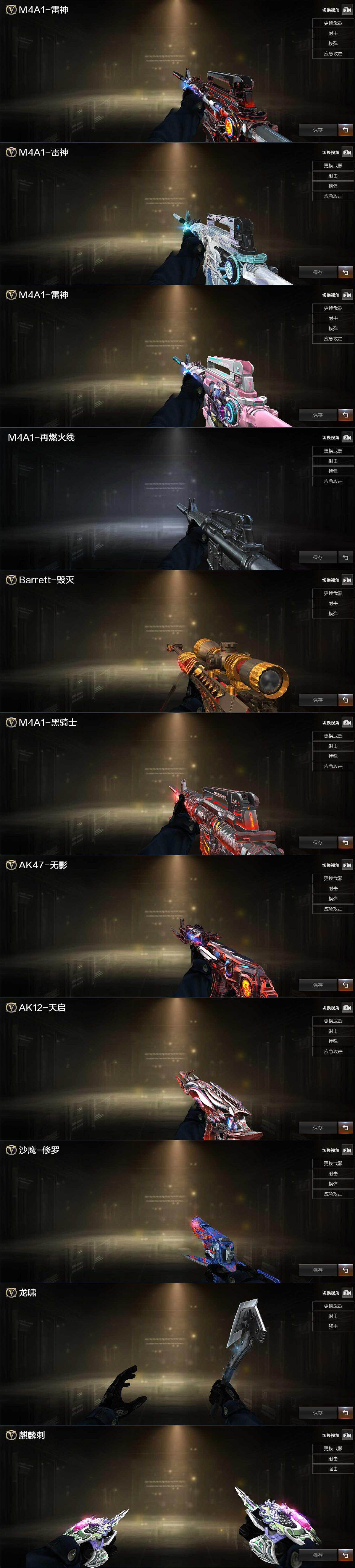 【皮肤】:雷神-暗月,雷神-化蛇 皮肤,雷神-诺拉 皮肤,M4A1-再燃火线,毁灭-英雄计划 皮肤,黑骑士-暗月,无影-暗月,天启-暗月*2,修罗-能量核心,轻型军用手斧-再燃火线,麒麟刺-萌杀皮肤